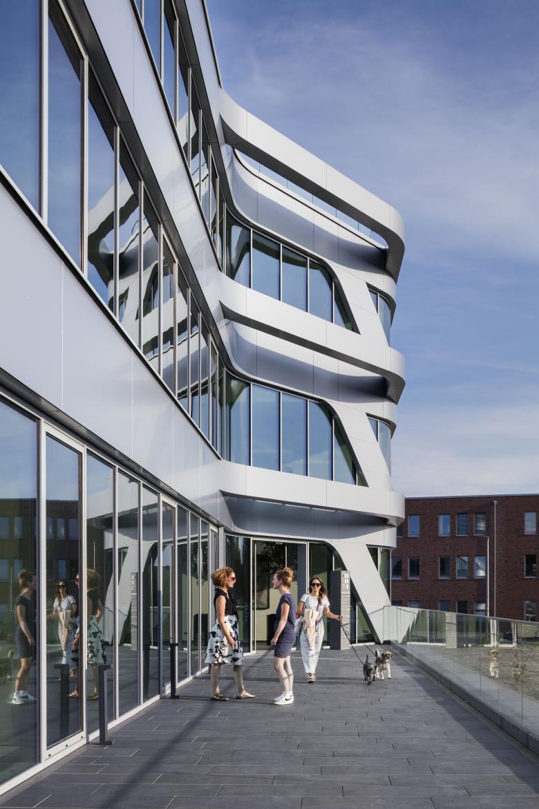 Der Umriss des Gebäudes weist keine rechten Winkel auf, nur runde Ecken. Die hinterlüftete Leichtmetallfassade mit Dreifachverglasung ist zunächst durch eine Bänderung horizontal gegliedert. Die strenge Horizontale wird aber durch schräg verlaufende Fassadenbänder und auskragende Fassadenelemente aufgebrochen. Durch die Metallstruktur gemeinsam mit den vielen Glasflächen erscheint das Gebäude sehr grafisch.