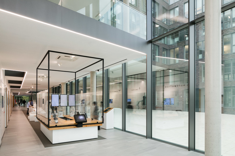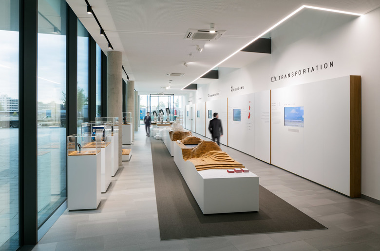 So gruppiert sich das Gebäude mit seinen vielfältigen Nutzungen, darunter Büroräume, Konferenzzonen, Werkstätten sowie ein Showroom, um eine gläserne Magistrale. Durch ihr transparentes Erscheinungsbild, das im Kontrast zu den ansonsten massiven Gebäudeteilen steht, hat sie bereits von weitem eine anziehende, begrüßende Wirkung.