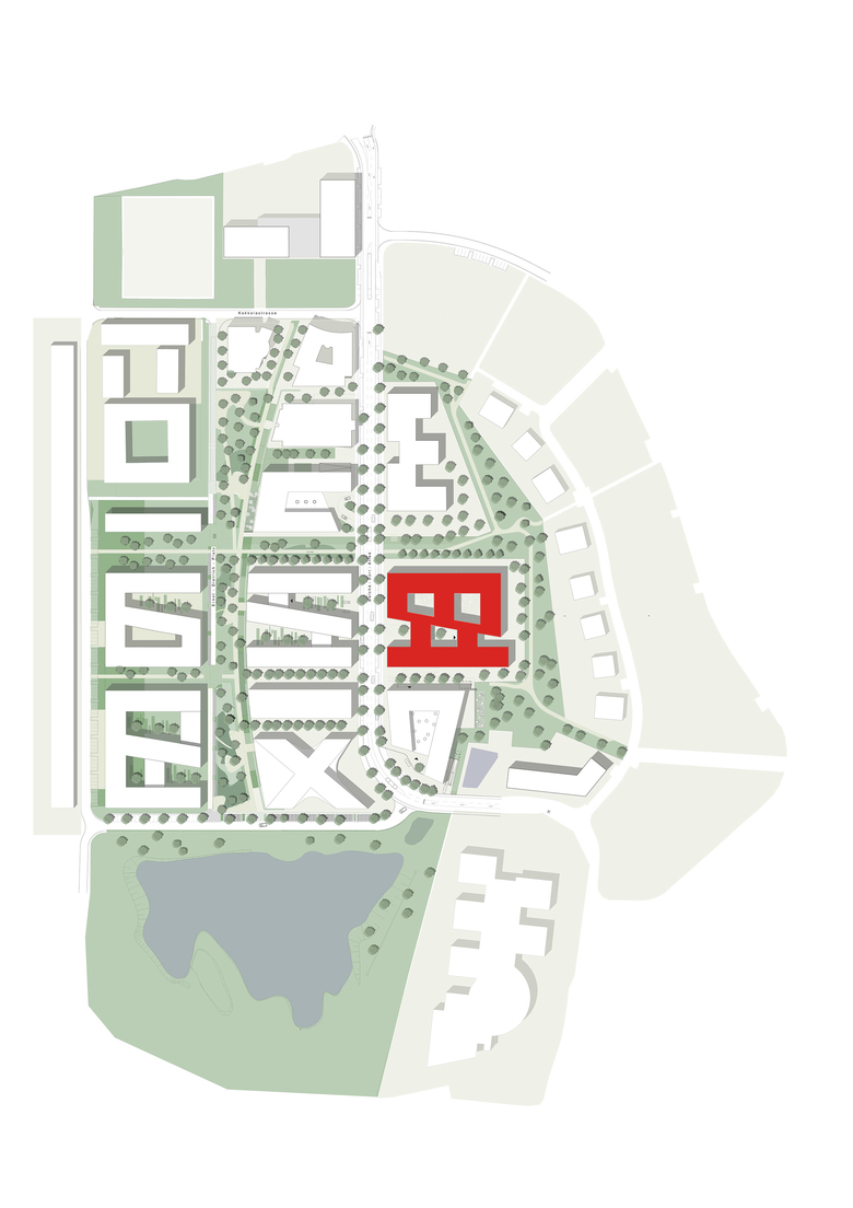 Ihre Wirkung als Wiedererkennungsmerkmal des Gebäudes wird durch die angegliederten begrünten Höfe verstärkt und weitergeführt. Über die Höfe hinaus entstehen durch die bodentiefen Fenster Sichtbeziehungen zu jedem Arbeitsplatz an jedem Ort des Gebäudes.