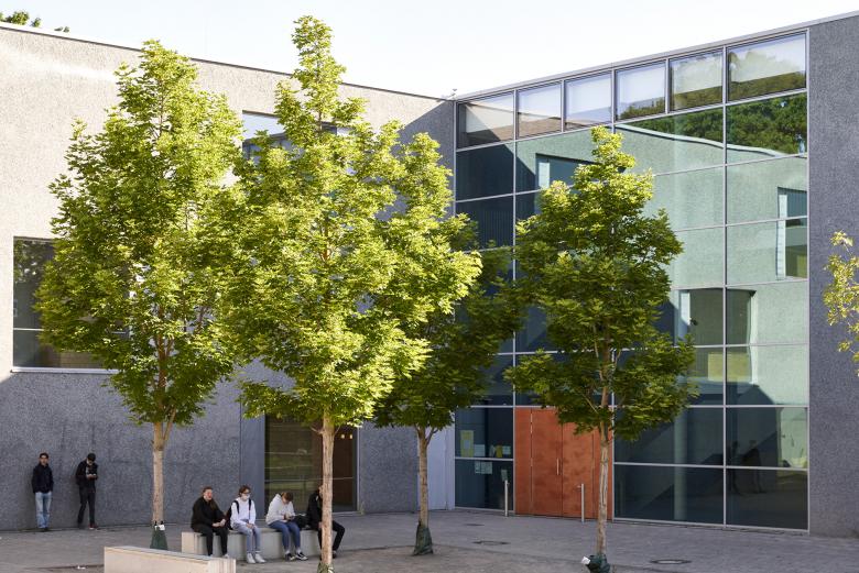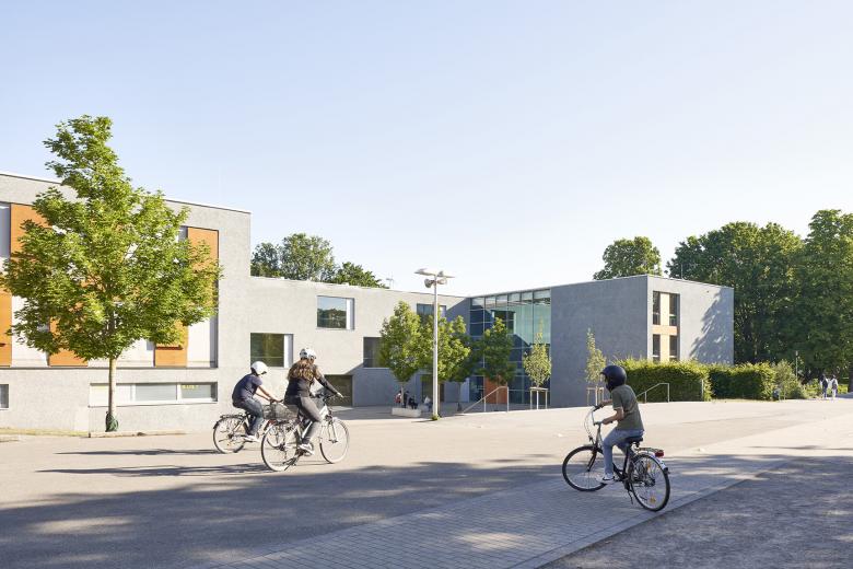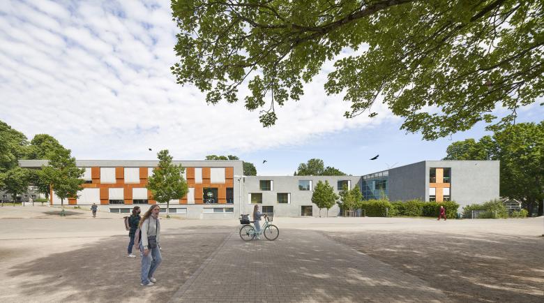 Herzstück der Schulgebäude ist ein zentral gelegenes, von Klassenräumen umrahmtes Forum, das als multifunktionale Aula und Stadtteilzentrum gleichermaßen konzipiert ist – ist sie doch gleichsam Fortführung und Schlusspunkt einer Stadtallee. Schule und Stadt treten hier in einen lebendigen Dialog.
