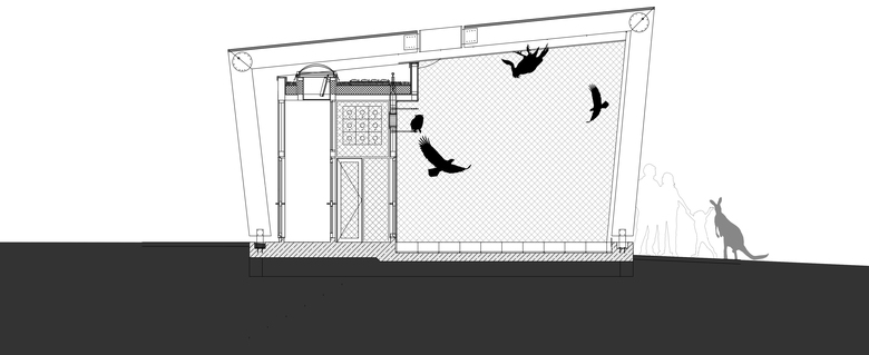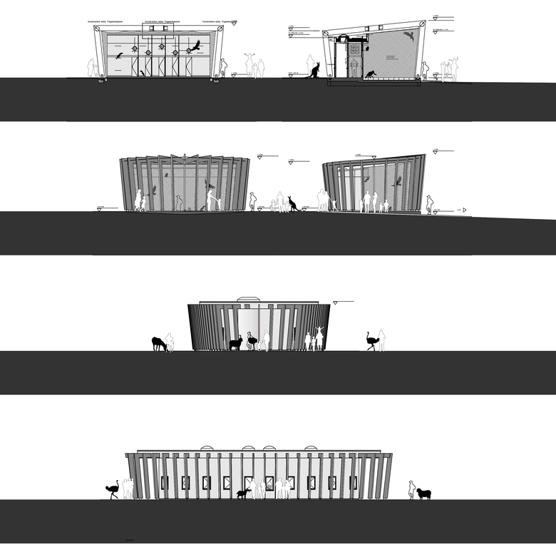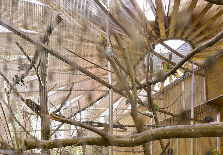 Die lamellenartige Fassade von Voliere und Stall verstärken diesen lebhaften Effekt und verleihen den sehr funktionalen Volumen eine zweite Ebene. Der einladende Charakter ist auf die Augenhöhe von Kindern abgestimmt und soll zum Verweilen einladen.
