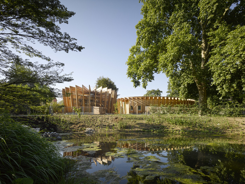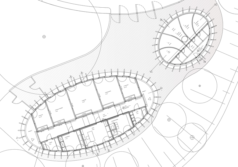 Das Ensemble reagiert mit seiner formalen Gestalt stark auf den städtebaulichen Kontext sowie die spezielle Nutzung. Die exponierte Lage im südlichen Teil des Schlossgartens in direkter Nähe zum Teich lässt die zwei Gebäudevolumen und den dazugehörigen Zaun spielerisch vermitteln und schafft wechselnde Blickbeziehungen von allen Richtungen. Auf diese Weise wirken die drei Elemente sehr stark als ein Ganzes, welches aber aufgegliedert und leicht erscheint.