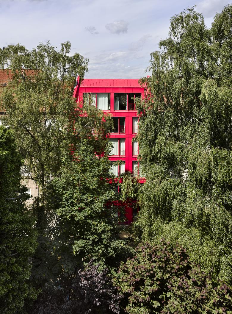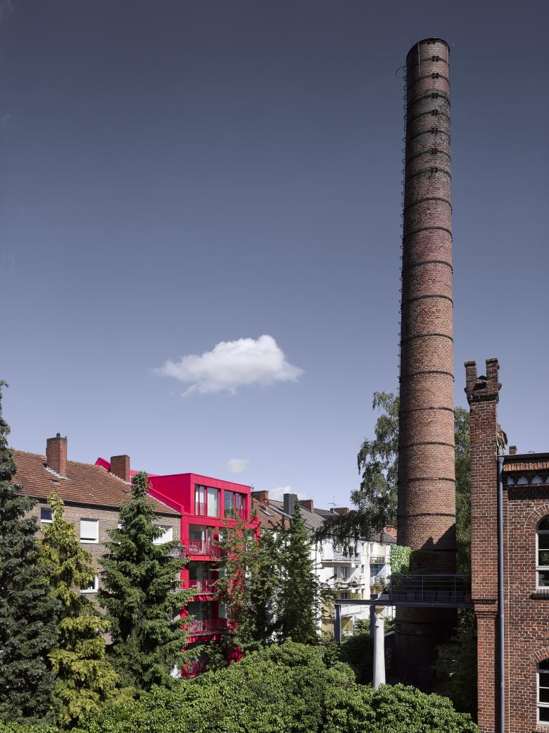 Auch setzen die beiden stark auf Farbe, was Ihrer Meinung nach das Viertel sehr gut vertragen kann. Neben den roten Backstein sowie gedeckten Farben der Putzbauten sticht das Himbeerrot leicht hervor. Das ehemaligen Arbeiterviertel bekommt damit einen neuen Baustein, der von Innen heraus kommt und sich klar zur eigenen Familie und Herkunft bekennt.