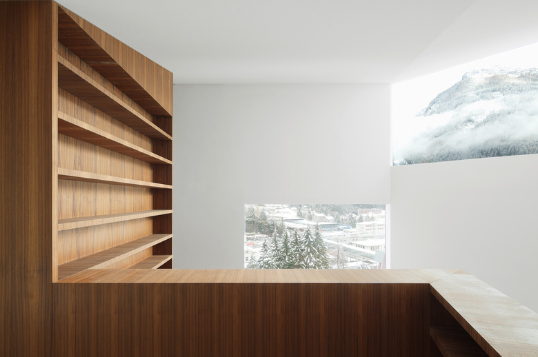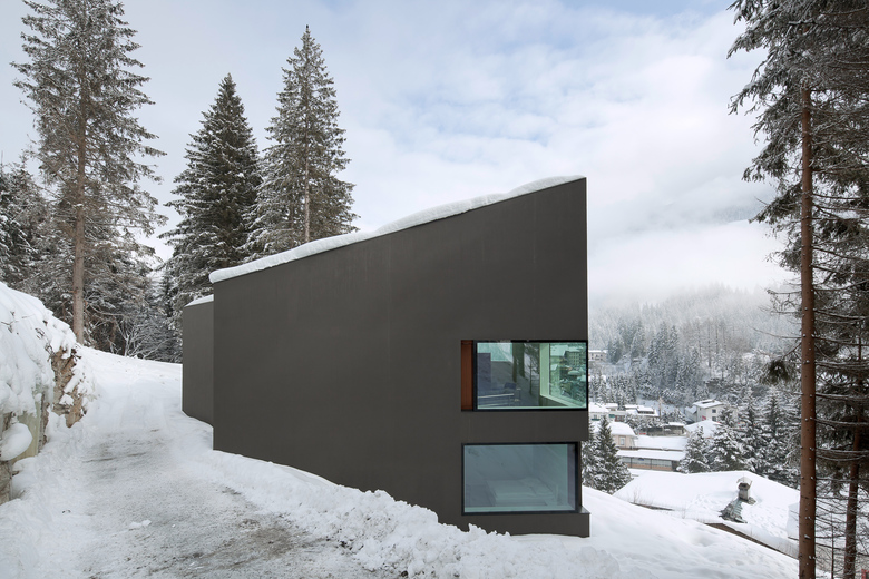 Constructed on a steep and narrow site in the higher reaches of the Alps, the villa was built as an appendix to a hotel complex located further down the slope. Attention is drawn to this solitary form by its clear edges, while the darkened reinforced concrete facade, constructed without protrusions or recesses, fuses it with the alpine setting in the summer. In contrast to the strict outer appearance the rooms inside are not bound to a fixed structural level. The elaborate spatial differentiation allows for helically complex spaces, where the altitude of each level shifts one meter higher in an anti-clockwise direction. According to their function the rooms vary in horizontal dimensions, as well as in height. This ensures not only a maximum of living space but also a harmonious formation of rooms. The large window openings and the low parapets help to dissolve the limiting frame of out and inside, allowing one to become immersed in the panoramic views of the area.
