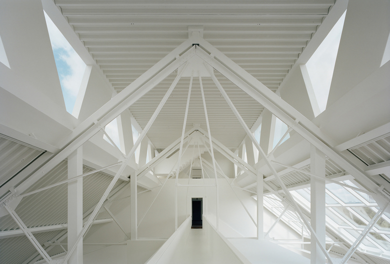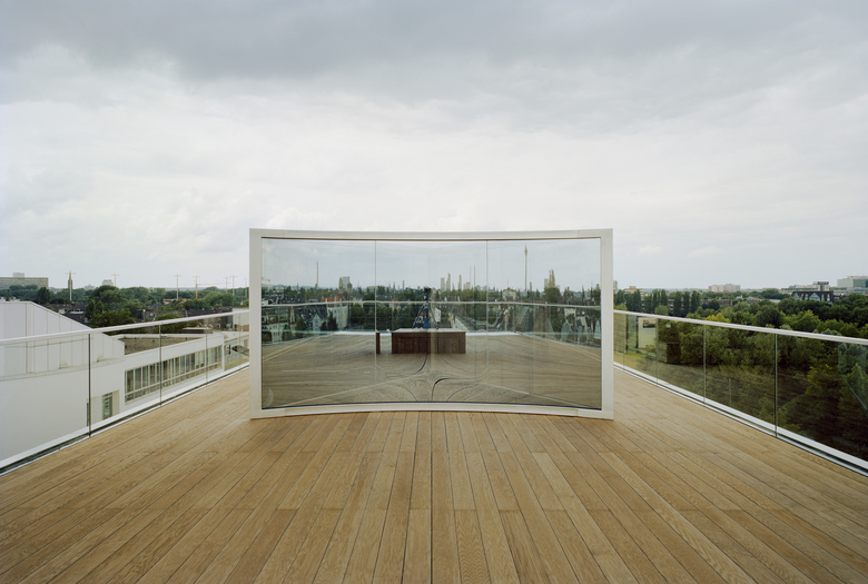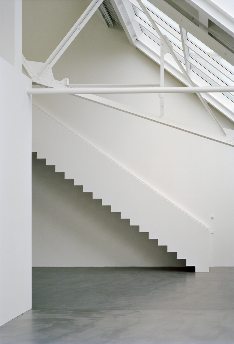The conversion of the former factory building for the Julia Stoschek Collection is characterised by two contrasting stipulations: the landmark facade was to be preserved in its original form, while the interior organisation was to be rearranged to form a habitable art repository with a collection of contemporary media art. This was achieved through a house-within-a-house construction: the installation of a second wall leaves the outward appearance of the façade untouched and at the same time meets the demands of the installation projects in the year-long exhibitions. The exhibition areas, which sit on top of one another, are spatially connected through a large opening in their ceilings. The exhibition route follows this vertical opening and leads the visitor up through the levels of the building, from the projection room in the basement, to the public exhibition areas on the ground floor and first floor, to the large collector’s 12-metre-high loft, which is flooded with light. From here you can reach two private floors via a delicate staircase construction, followed by the roof platform. On top of the new extension, it forms the crowning conclusion, its sign-like character referencing the former logo that once shone above the building.