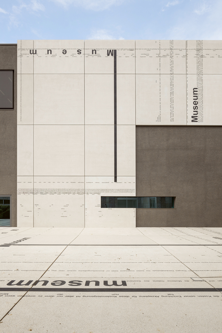 In 2009, work began on the expansion of the Moderne Galerie in Saarbrücken, but it came to a halt in 2011, leaving the building unfinished. The following year, a public tender for a new facade concept was won by architects Kuehn Malvezzi with artist Michael Riedel. Their project starts from the controversies that surrounded the museum’s expansion to rethink the relation between the museum and the public sphere.