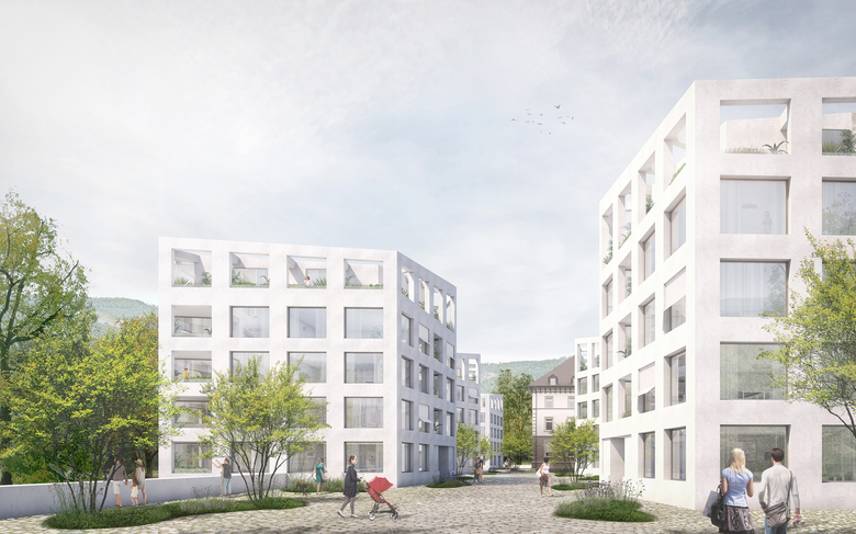 An office building situated on the northeastern tip of the new district creates the welcoming prelude, shielding the buildings in the valley. In the valley area along the Dettenbach river, new neighbourhoods for young families are planned, orientated around three communal courtyards.