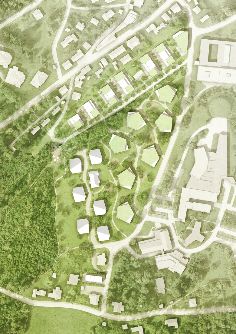 The concentration of the building volume on seven crystalline structures creates space for an extensive flowing parkland which offers a gentle transition between the city and the forest landscape. The careful alignment of the multi-faceted 5-story buildings allows for wide views from all the apartments and creates a variety of in-between spaces.