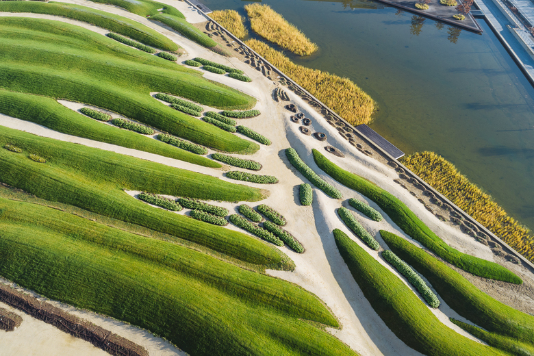 Auf der Sommerinsel in Heilbronn öffnet mit der Bundesgartenschau 2019 einer der ersten 3D-generierten und gebauten Landschaftsparks, der die Formen von Moränen, Dünen und Sandlandschaften vereint.