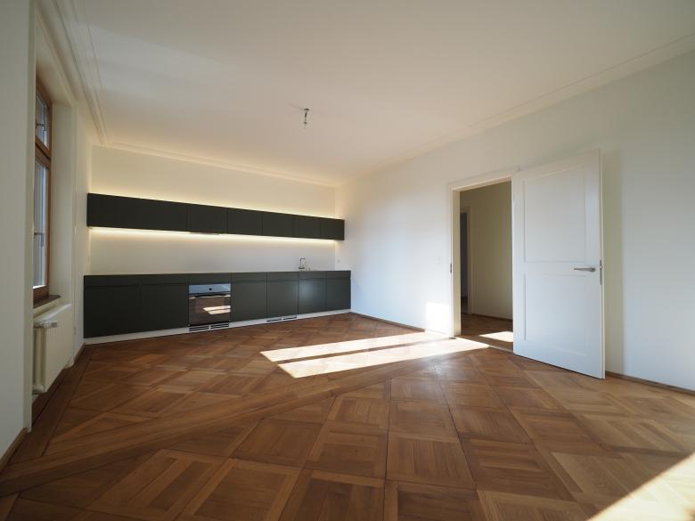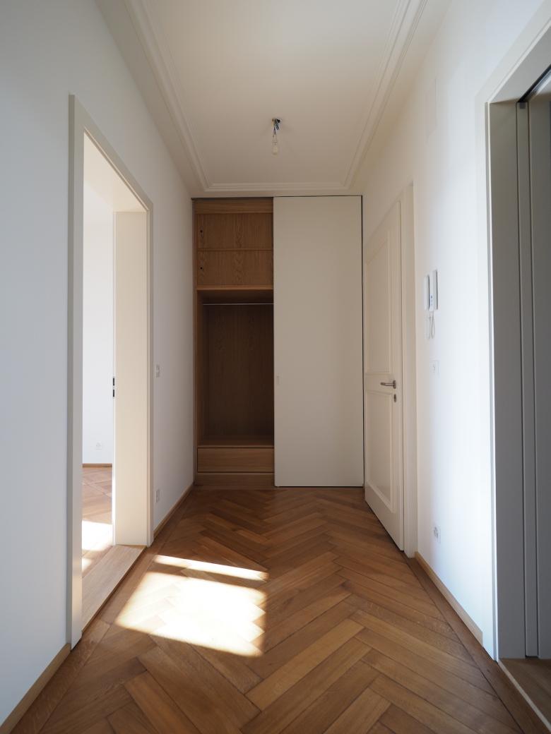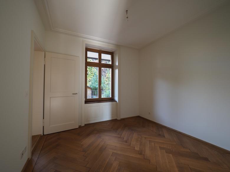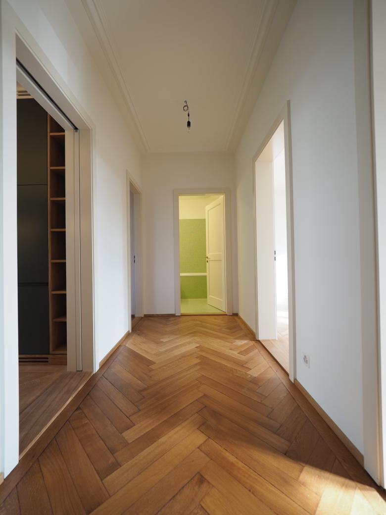 Die Maisonette Eigentumswohnung in der denkmalgeschützten Liegenschaft wurde wieder in zwei individuelle Wohnungen unterteilt. Im Innern wurden u.a die Küchen sowie die Badezimmer saniert - leicht vergrössert sowie kleine, präzise Eingriffe zur Aufwertung der räumlichen Qualität vorgenommen.