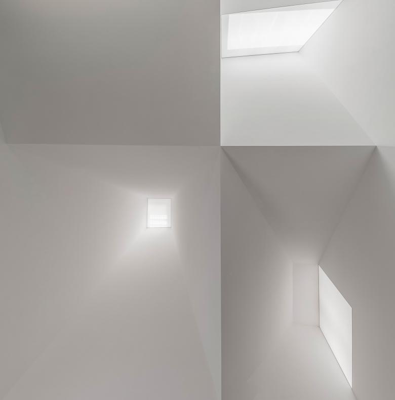 Die Decke, konstruktiv ein Raumkreuz, bildet vier Bereiche aus, von denen sich drei als tiefe Trichterformen in verschiedene Richtungen nach außen hin öffnen. Durch Membrane gefiltert wird das Tageslicht in den Öffnungen zu Lichtflächen „materialisiert“. Sie werden zu einem entscheidenden Teil der architektonischen Komposition.