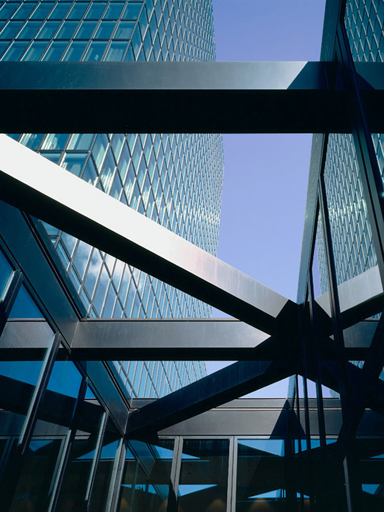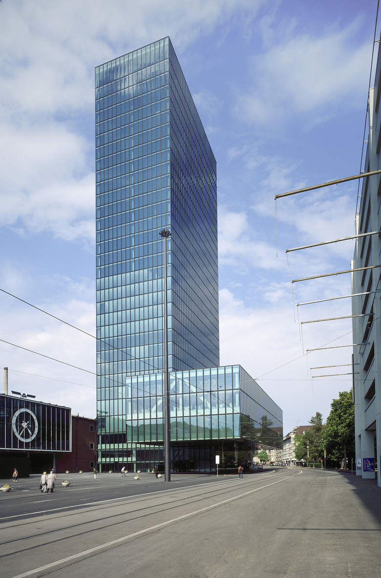 Im Zusammenhang mit dem Standortentscheid einer Erweiterung wurde das Konzept «Messe Basel plus» ausgearbeitet. Die Zielfestlegung bestand darin, die logistischen, funktionalen und städteräumlichen Defizite aufzuwiegen und ein neues identitätsstiftendes Wahrzeichen für die Messestadt zu etablieren. Ausgangspunkt ist ein Hochhaus. Dieses wurde, wie beim Lever House in New York, mit einem podiumsähnlichen Sockel ergänzt, welcher ca. sieben Meter vom Boden abgehoben wurde. Er kragt 12 Meter nach Osten und 24 Meter nach Süden aus. Auf der Achse von der mittleren Rheinbrücke zum Badischen Bahnhof drängt der auskragende Bauteil in das Sichtfeld und perspektiviert den Raum. Der Turm des Hochhauses dagegen überragt als neues Wahrzeichen den Stadtkörper. So wirken die beiden Gebäudeteile städtebaulich aus der Ferne und aus der Nähe. Eine von aussen sichtbare Stahlfachwerkkonstruktion erlaubt, das Innere weitgehend stützenfrei zu halten und überdies das Gewicht des Auslegers zu reduzieren. Plastizität wird durch eine homogene Fassadenhaut erreicht. Die differenten Nutzungen und deren Strukturen sind der transparenten Fassade hinterlegt und thematisieren auf einer zweiten Wahrnehmungsebene die räumliche Tiefenwirkung des Gebäudes.