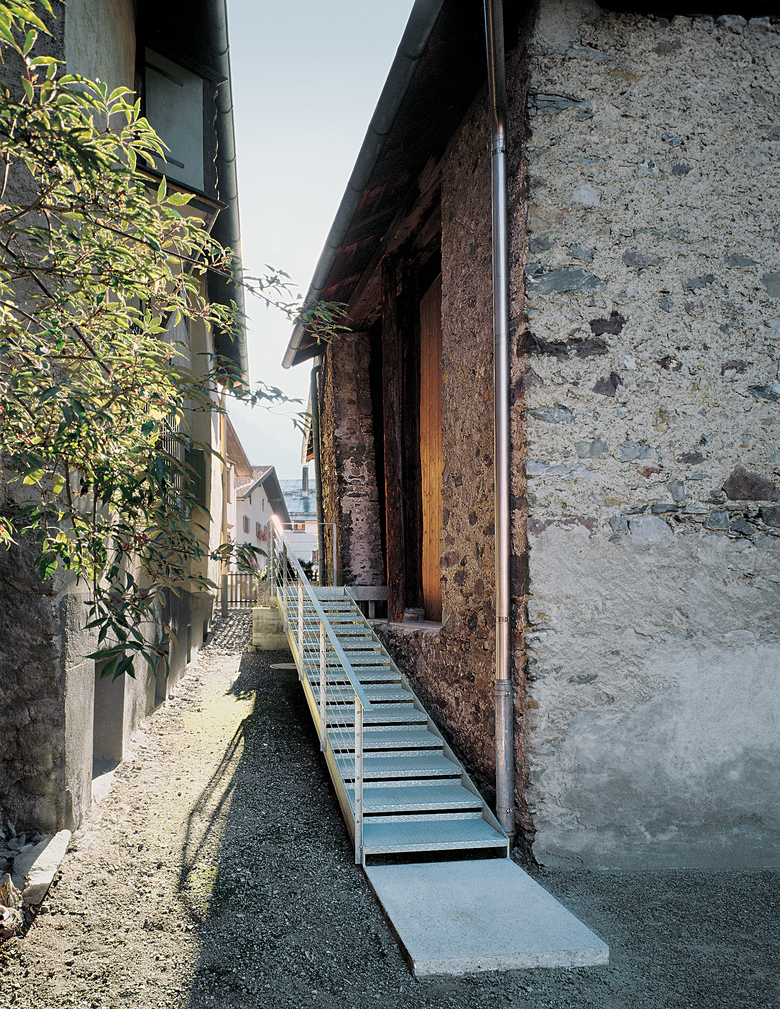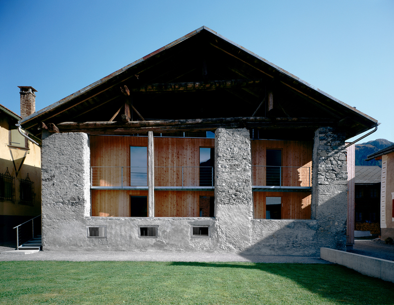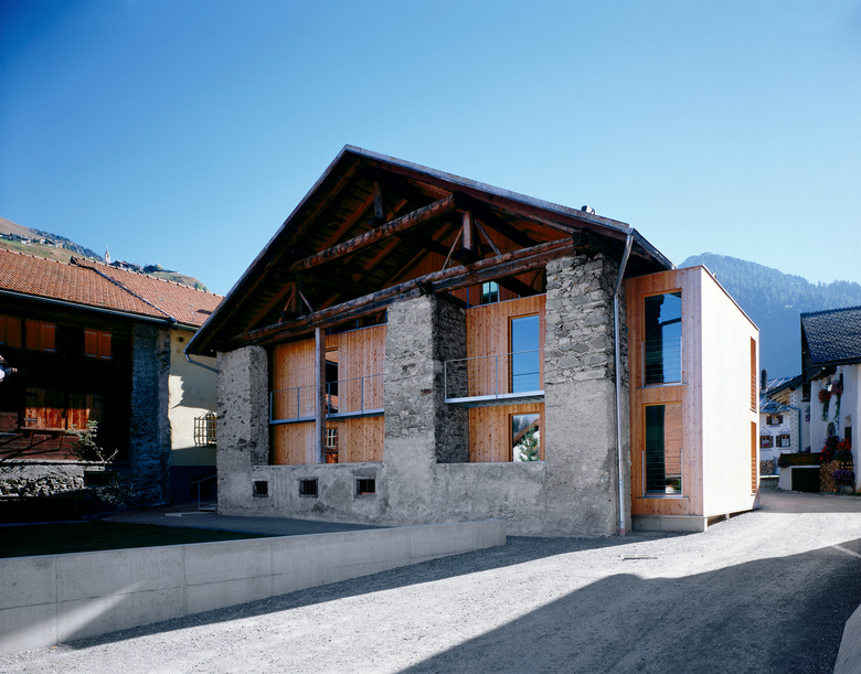 Bergün ist ein Bergdorf in Graubünden. Die Morphologie dieses Ortes ist geprägt durch die Zweiteiligkeit der Dorfhäuser: ein steinernes Wohnvolumen zur Dorfmitte, ein direkt anschliessendes, landwirtschaftlich genutztes Volumen mit Holzausfachungen zur Landschaft hin. Ausgangspunkt dieses Projekts war eine Umnutzung. Der Einbruch einer neuen Nutzung in eine alte Struktur wurde im Projekt bildlich aufgenommen. Das neue Volumen schiebt sich zwischen die bestehende Konstruktion und steht platzseitig etwas aus der alten Hausfront hervor. Dadurch wird auf das entwerferische Vorgehen der Verfremdung hingewiesen, aber, zusammen mit den anderen Häusern am Platz, auch ein klar definierter Aussenraum geschaffen. Die räumliche Schichtung des Eingriffs zeigt sich im Zusammenspiel der verschiedenen Fassadensysteme: Dem grossflächig, unregelmässig geöffneten alten Gebäude aus Massivmauerwerk wird eine regelmässige, gleichzeitig auf ihre Vorfabrikation hinweisende Fassade aus Holz mit sich repetierenden Fensterelementen gegenübergestellt.