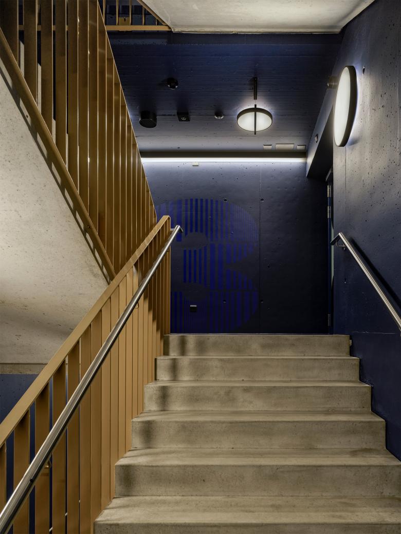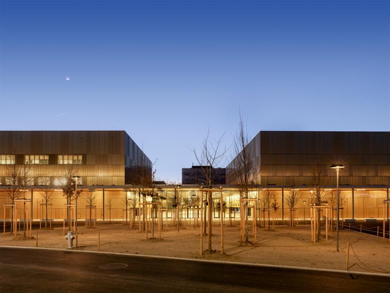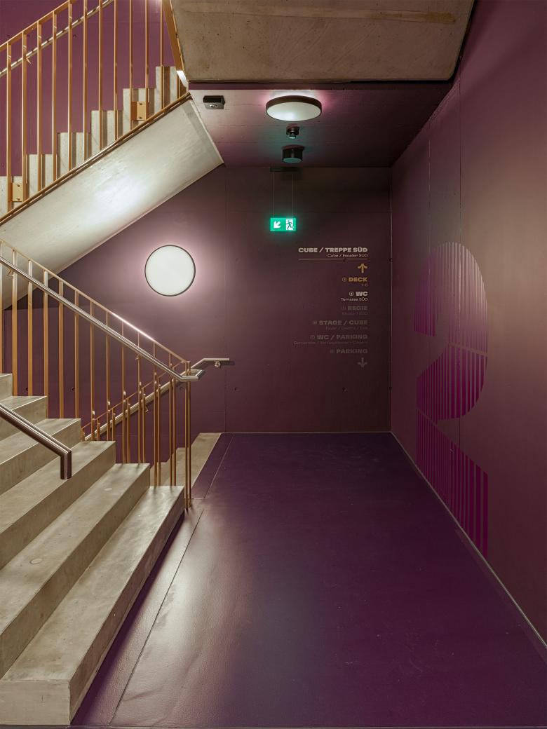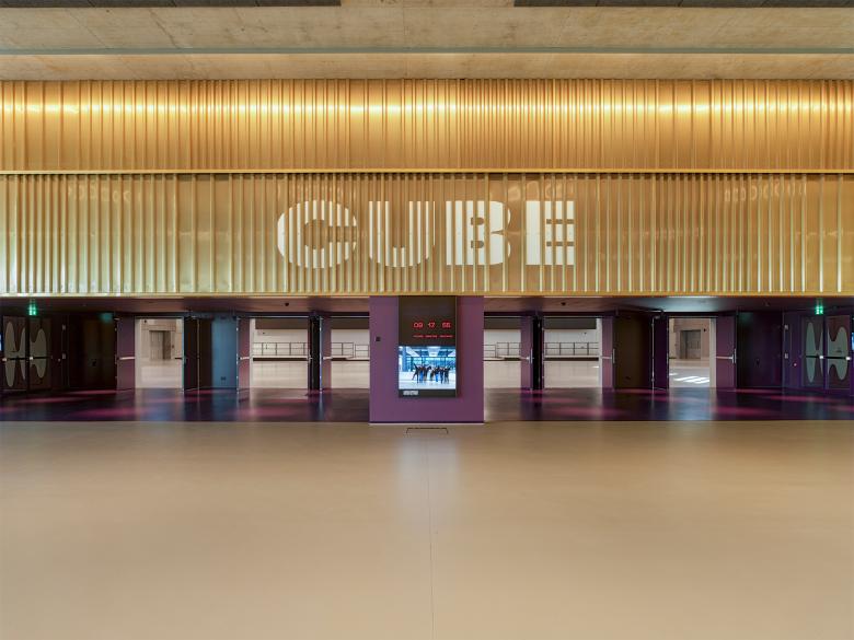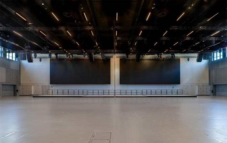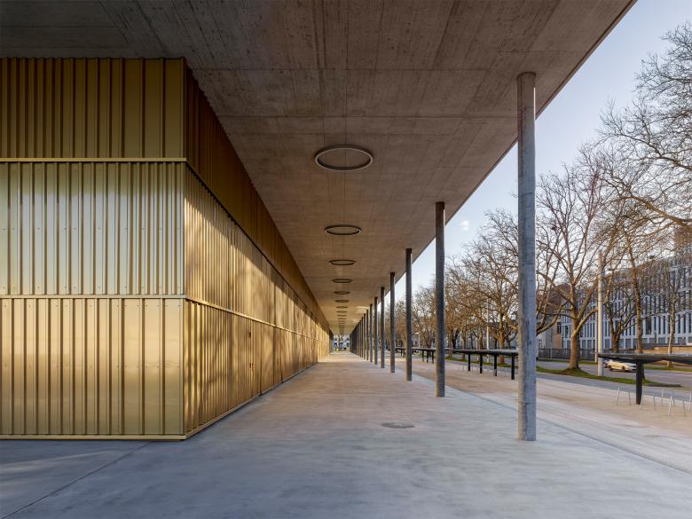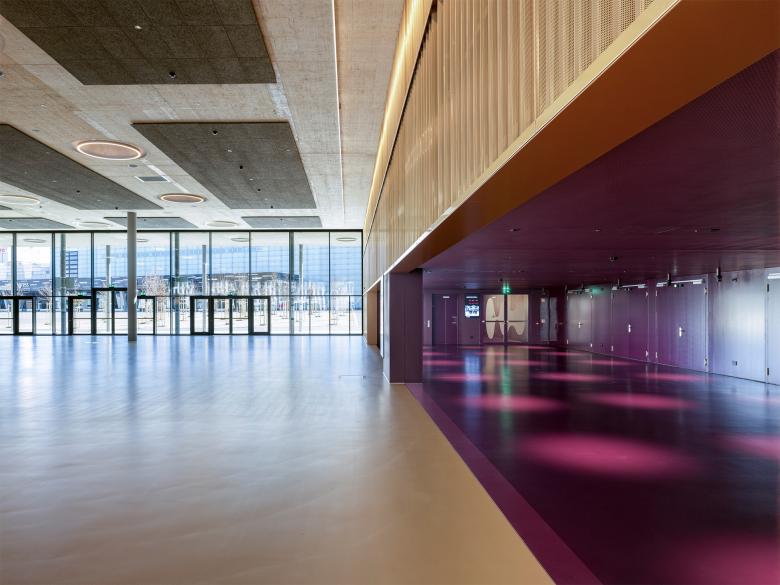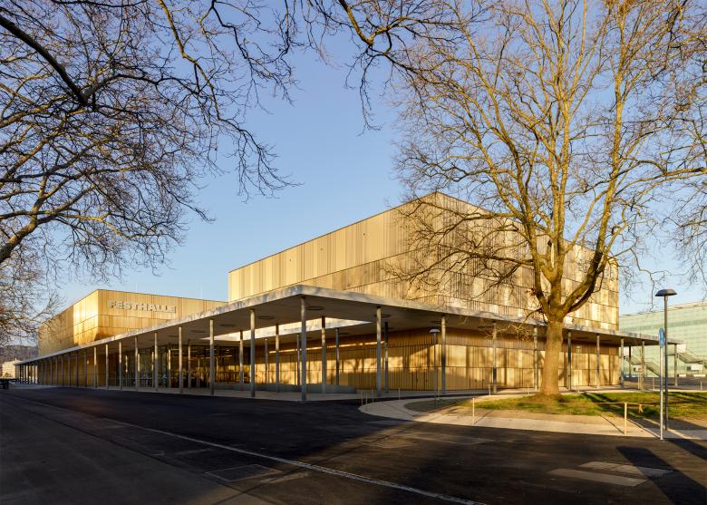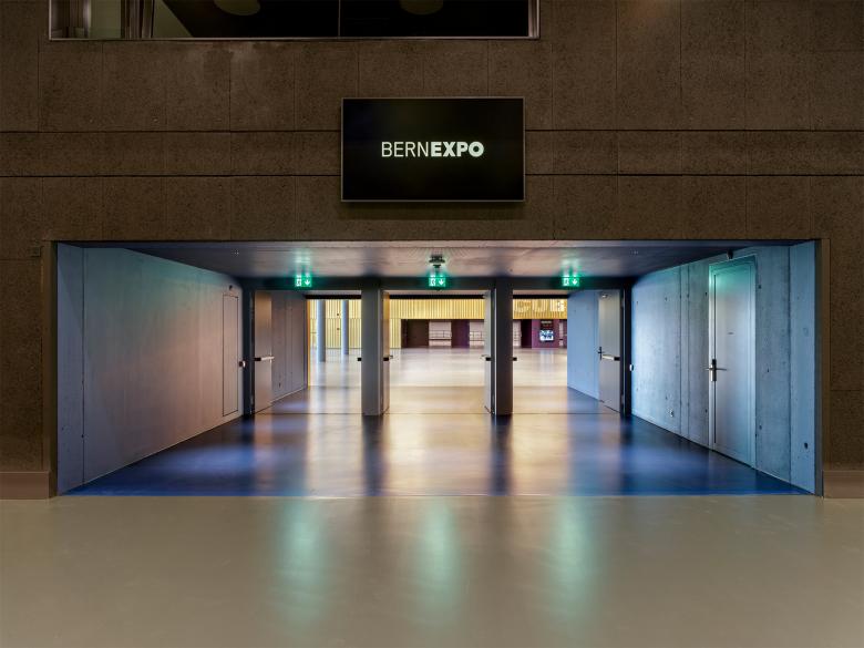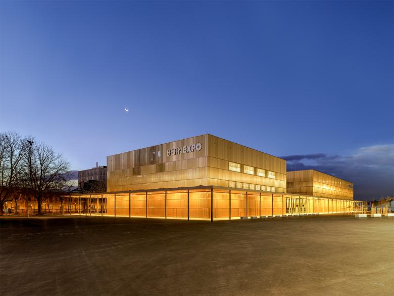 Der Neubau ist eine auf Anhieb lesbare Einheit aus drei Teilen. Eventhalle und Kongress als unabhängig nutzbare, aufs Wesentliche reduzierte Volumen werden zusammengebunden durch eine einladende und Schutz bietende Laubenhalle, in welcher das gemeinsame Foyer integriert ist. Die grosszügige Laubenhalle verankert das neue Kongress- und Eventcenter und den ganzen Ort besser im Quartier, im Stadtgefüge und im städtischen Leben. Das der Laubenhalle eingeschobene Foyer mit hohem öffentlichem Charakter ist der künftige Hauptankunftsort und Zugang zum Messegelände. Es verbindet und trennt gleichzeitig die beiden unterschiedlichen Nutzungen von Kongresszentrum und Eventhalle. Die Baukörper selbst weisen eine homogene Haut mit unterschiedlichen Graden an Transparenz auf.