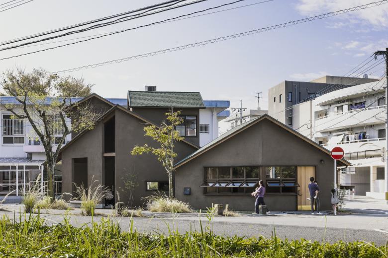 暮らしのイメージとしては街とのんびりとした連続感があり、人が気軽に集まり長居してしまうような居心地の良い家をご希望されましたが、幅員30mと幅員4mという両極端な2つの道路に面した角地であり、しかも三角形であるため敷地周長の2/3以上が道路に接していました。あからさまに住宅の横に店舗があるのも、あからさまに住居の一部が店舗であるのもプライバシーが守りにくそうです。そこでまず用途より先に大小の屋根がぱらぱらと分散しているような全体像をイメージしました。そしてその屋根の下にいろんな内外のスペースを内包するように計画しました。平面形状がいびつであることから見る場所によって表情を変える複数の切妻屋根の連なる外観は、内部を想像されにくくしてご家族の暮らしを守るとともに、ダイナミックな軒先の変化が街ゆく人、子供達にとって も親しみのある存在になる事を目指しました。