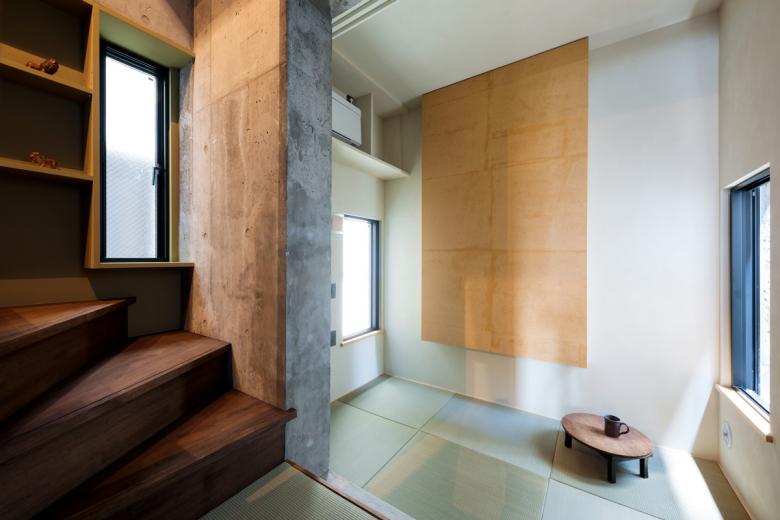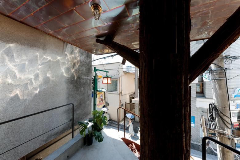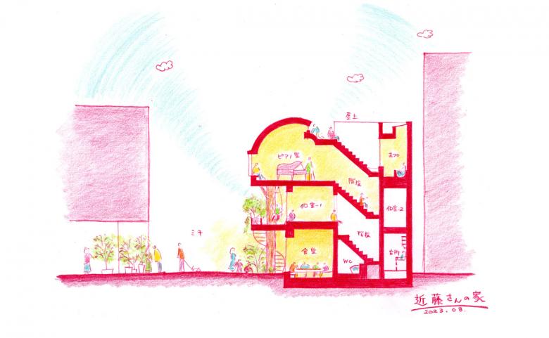 構造は1,2階をRC造、3階を木造として建築の軽量化を計りつつも、3階を支える円柱や外階段という街と暮らしの境界の要素はあえて肥大化させています。
