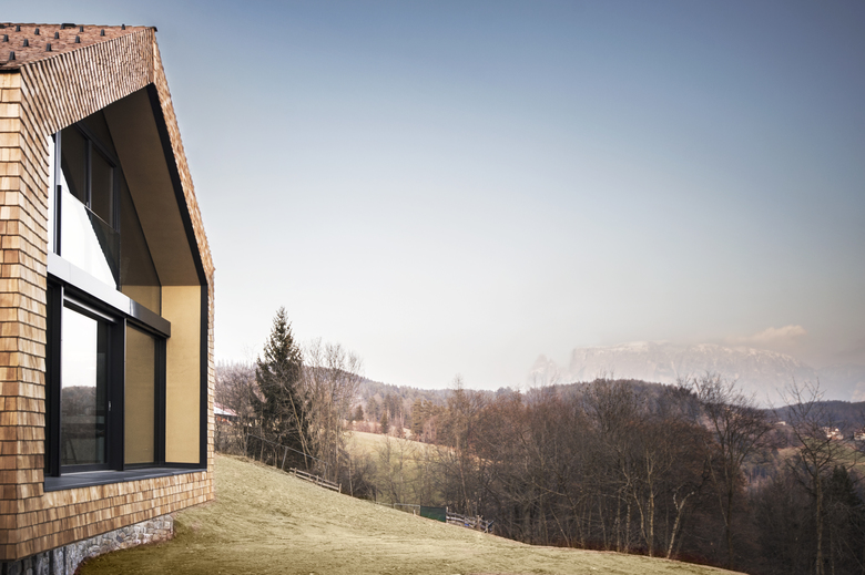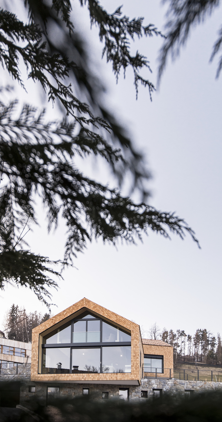 The aim was to implement the architecture into the surrounding in the most natural way; therefore it was important to underline and reinforce local building traditions. The natural stone wall forms the basis of the architecture and softly melts into the landscape. Two simple houses with pitched roofs and covered all over with shingles sit on the stone wall and are looking towards the most impressive mountains scenery. The orientation of the building volumes was chosen carefully in order to view the Schlern and the Rosengarten as the central elements. The front facades are fully glazed and allow the interior to totally open up to the landscape.
