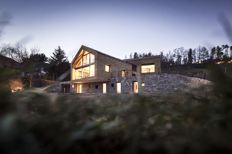 The Villa “Am Steinbruch”, a private house hosting two families, is established in the outskirts of the village of Oberbozen / Soprabolzano facing the great mountain panorama of the Dolomites. The place is a former quarry, which was the starting point in the development of the concept.