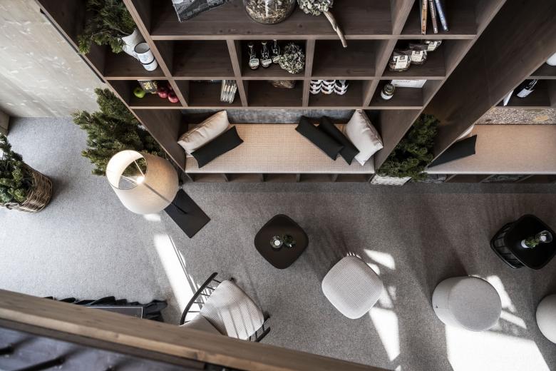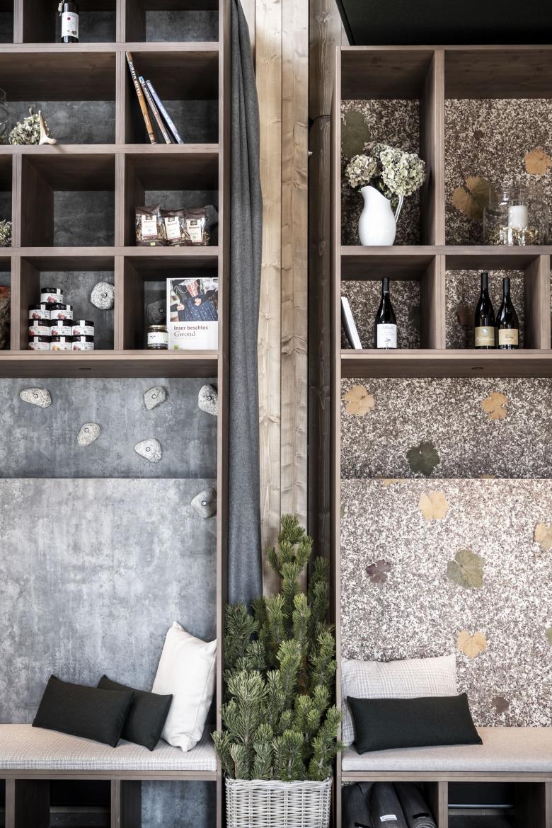 The area facing the village square can be used diversely and playfully. The two-story partially glass façade provides a generous openness to the space and offers one to be able to host a variety of different situations. When the stage and standing tables give way to the lounge situation, there are comfortable sitting areas with seating furniture around small tables between small exhibition boxes and fragrant plants and herb gardens hanging from the ceiling, which in turn are used for show cooking. The historic chandeliers, with their fresh black paint bring a cosy feeling and unique characteristic to the space. noa* came up with something extraordinary for the presentation of local quality products: four large wooden shelf racks, each with a recess to invite you to linger and allow you to immerse yourself even deeper in the region of South Tyrol. The back side consists of panels on which hay from the Passeier valley, bright vine leaves, fragrant pine chips from Seis are pressed together into a type of wallpaper and a simulated rock wall including climbing grips made in South Tyrol have been pressed. The three-dimensional effect not only tempts you to touch, but also lets you perceive the smells of the country intensely and let your mind wander.