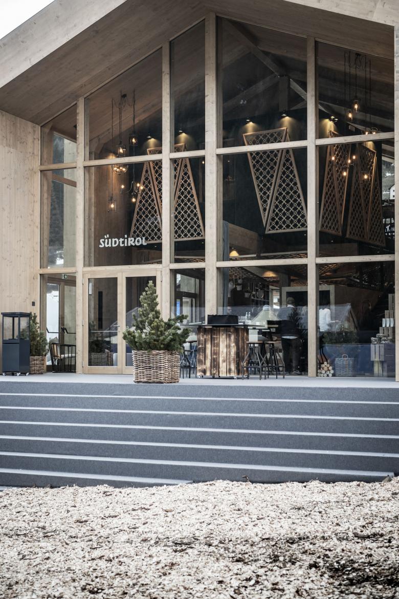 The attractive shell of Südtirol-Home, a modern interplay, where glass and wood create a game between the open and closed, was already under construction when IDM Südtirol, the innovation, development and marketing company commissioned noa* with the design of its interiors. A critical factor that had to be taken into account in the planning of the interior design, was that this temporary building should be easy to dismantle and assemble at other locations without major wear and tear. The main task for noa*, however, was to enable Südtirol-Home’ visitors to experience the location and the country in which the sporting event takes place in literally every sense.