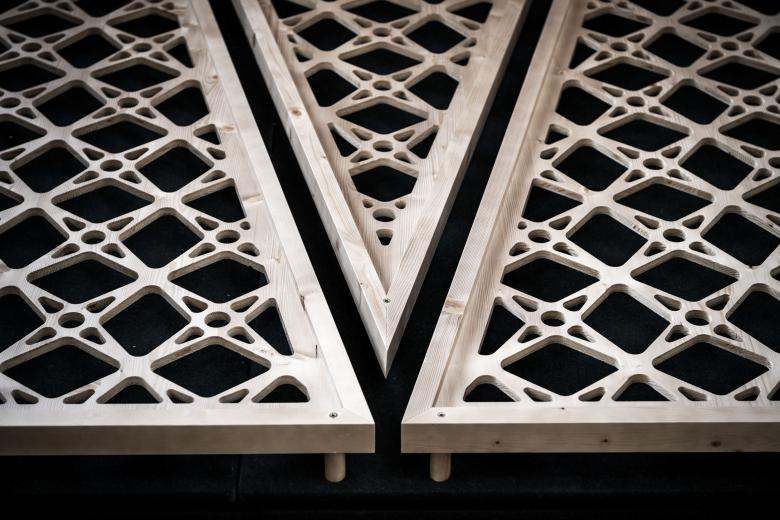 In order to make this room as authentic as possible, a restored old farm “Stube” was installed in the cube: There is a long bench under the window, which extends around the corner on both sides to the centre of the room and is combined with several tables in order to be able to stage a long table. An old, hand-made chest and cupboard with traditional paintings on the doors, the obligatory traditional “Stube” lamps and the wooden carvings are accompanied by an old traditional plank floor and a wood-panelling on the wall and ceiling. South Tyrolean tradition also comes into play on the outer coating of the cube, which is constructed in spruce wood and covered with typical green felt fabric, where triangular wooden patterned-panels inspired by knitting and built-in light sources decorate the box from the outside. This creates a beautiful play of light and shadows, from the light shining through the wooden patterns.