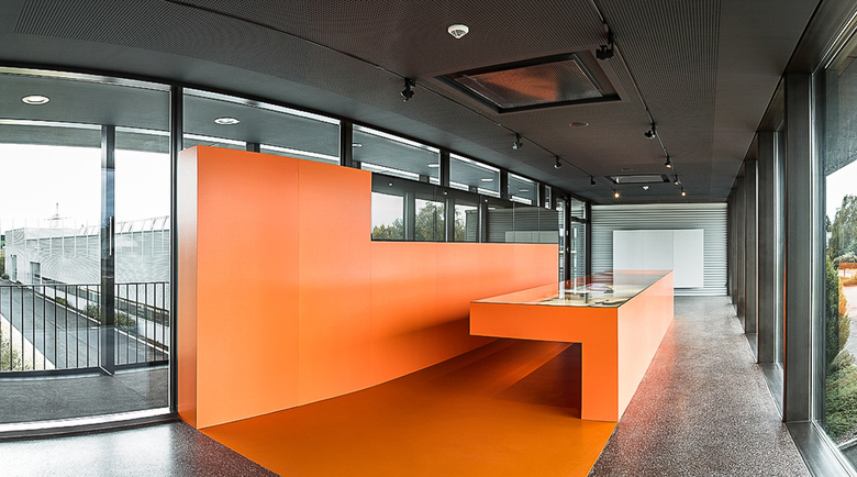 Das bauliche Verbindungsglied zwischen Kundenform und Werksrundgang. Über einen gestalteten Weg durch die Grünanlagen erreichen die Besuchergruppen den vollverglasten Startpunkt des über 2 km langen Besucherstegs. An einem Architekturmodell der Werksanlage werden die Gäste auf ihren Rundgang eingestimmt.