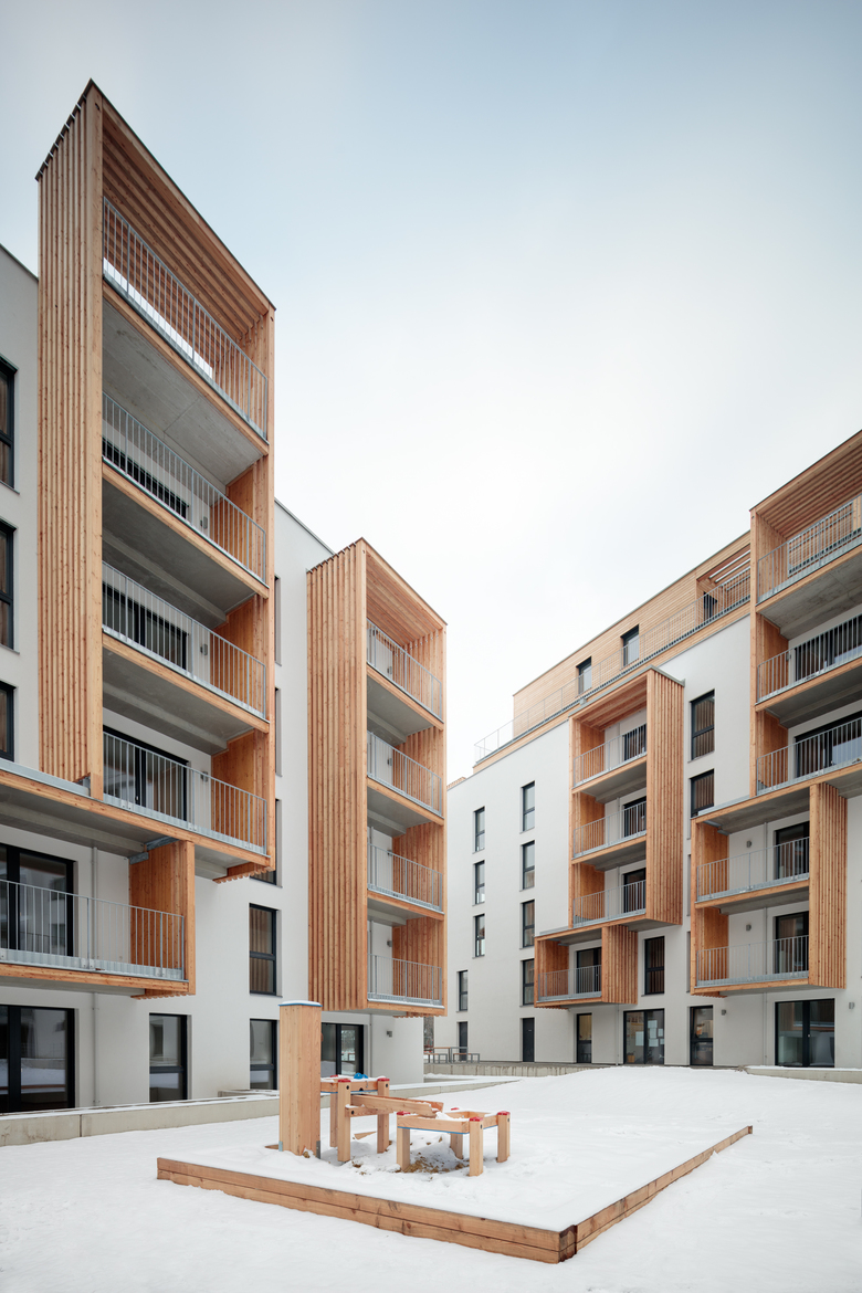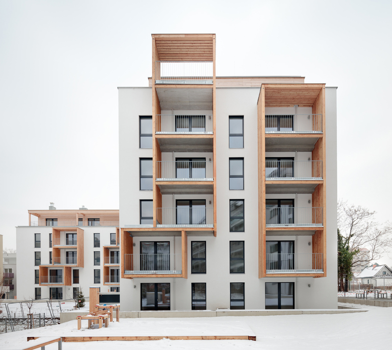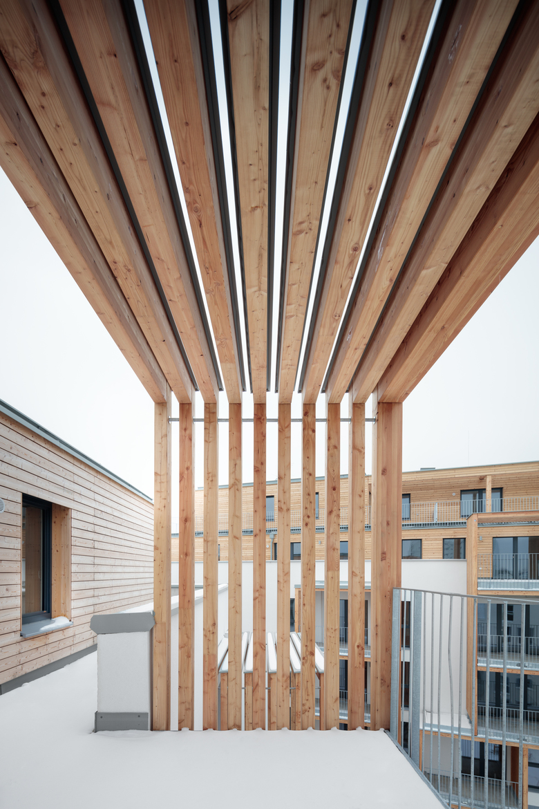 Türme spielerisch über die weißen Fassaden und bilden dort Balkone oder Loggien aus. Am Dach verwandelt sich die Holzstruktur vor den holzverkleideten Staffelgeschossen zur Schatten spendenden Pergola. Dahinter haben sich am Flachdach des hofseitigen Bauteils viele Hochbeete ausgebreitet. Sie warten darauf, von den ersten Mietern und Mieterinnen bepflanzt zu werden.