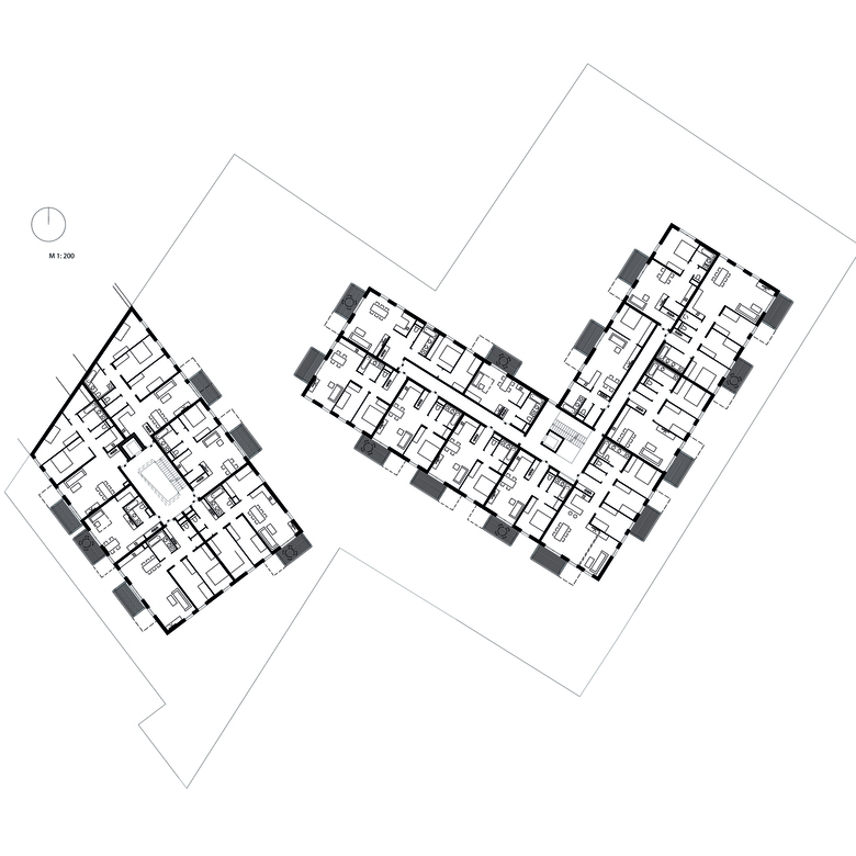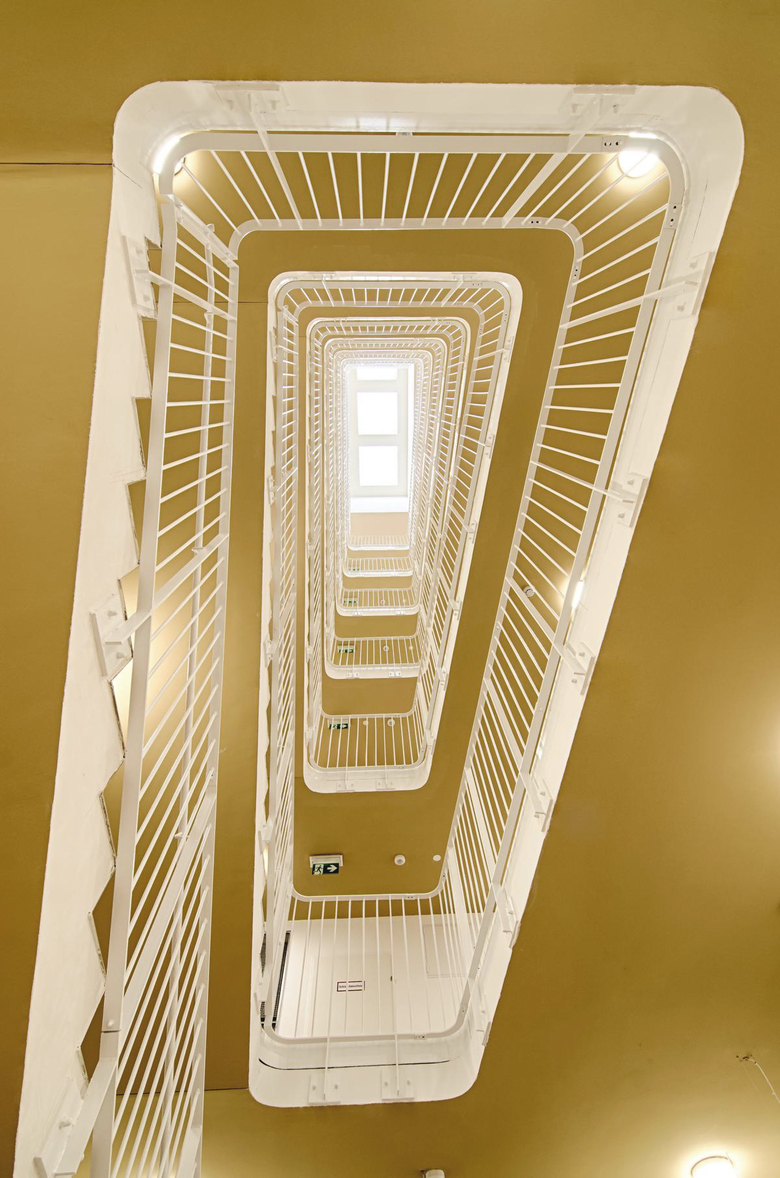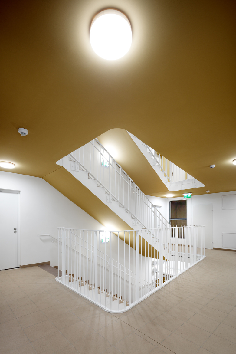 Außenwände verleihen dem Inneren viel Flexibilität. Im Punkthaus an der Straße adelt ein großzügiges, von einem Oberlicht erhelltes Stiegenhaus mit breiten Gängen, dessen zentraler Luftraum sich nach oben hin verjüngt, die Erschliessungsfläche zu einem kommunikativen Raum der Gemeinschaft. Ockerfarbene Untersichten und Seitenwände, die nach oben hin immer heller werden, verstärken den Effekt. Das großzügige Stiegenhaus sorgt außerdem dafür, dass die Wohnungen im tiefen Baukörper viel Licht erhalten. Sie sind durchwegs nach Nordosten und Südwesten orientiert. Auch im zweiten, L-förmigen Bauteil sitzt das Stiegenhaus an einer strategisch günstigen Position in der inneren Ecke: die Künstlerin Dora Mai bemalte seine 20 Meter hohe Seitenwand mit einem Bild von Mary Poppins am Trapez. Seine Farbigkeit erinnert an die 1950er Jahre und nimmt eine Tradition des sozialen Wohnbaus wieder auf. Das stärkste Wiedererkennungsmerkmal der Häuser aber ist die besondere Art der Loggien und Balkone: Unbehandelte Lärchenlatten, die mit der Zeit vergrauen, verwandeln die Balkone in ein charakteristisches Gestaltungselement. Leicht gegeneinander versetzt, tanzen sie als markante