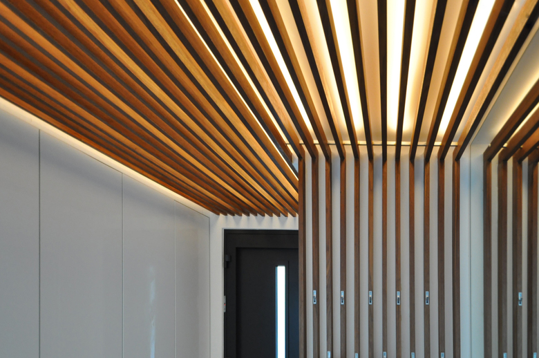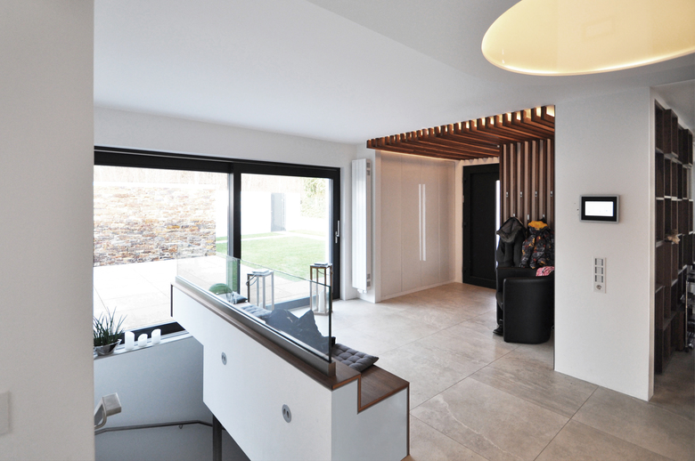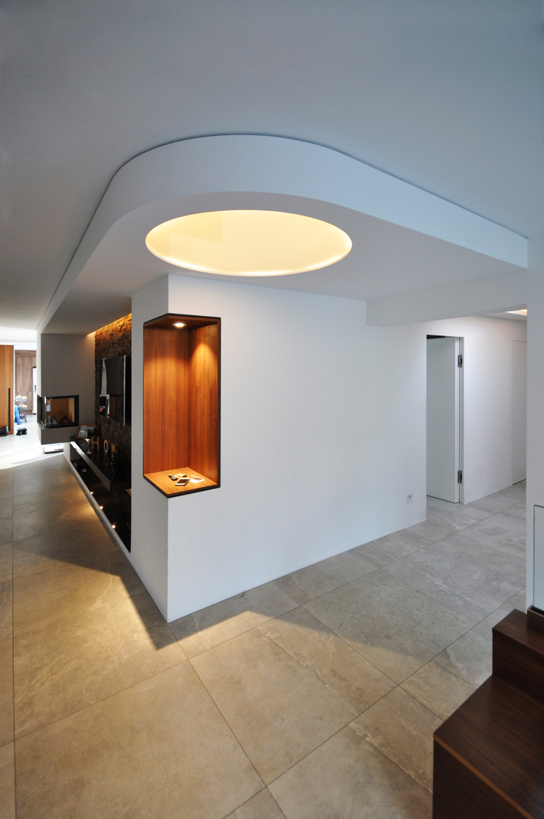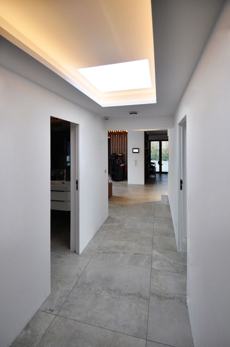 In der Tiefe des Raums bildet ein künst-liches Oberlicht den Kreuzungspunkt zwischen Wohnbereich und Indi-vidualräumen, und überträgt die Formensprache des Eingangs-Bauwerks in den Innenraum.