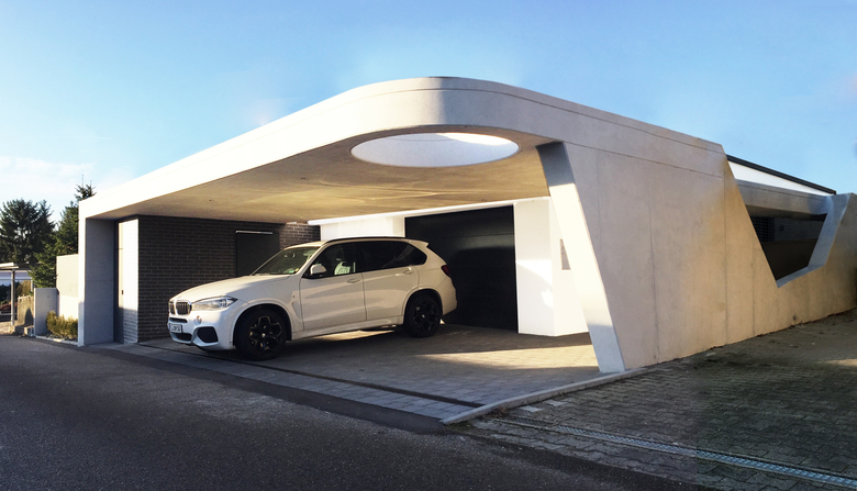 Sichtbeton und freie Formen bestimmen nun das äußere Erscheinungsbild des ansonsten eher schnöden Baukörpers. Der vorgelagerte Carport bildet nicht nur ein neues, unverwechselbares Gesicht, sondern auch eine einladende Eingangssituation.