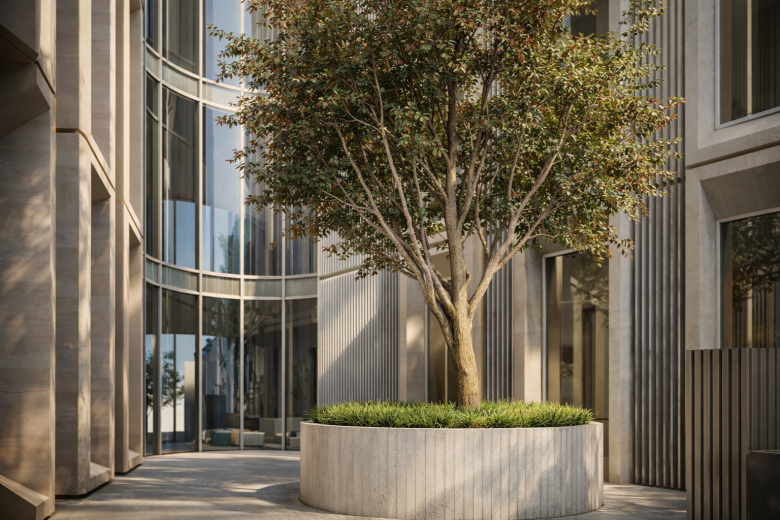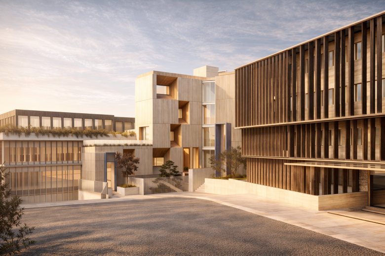 The intervention follows a dual strategy of transforming the existing architecture while introducing a unifying addition. The RAS building is rearticulated with a vertical wooden louver façade that overlays the existing stone surfaces, adding depth and solar shading while redefining the building’s architectural expression.