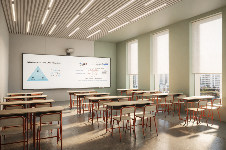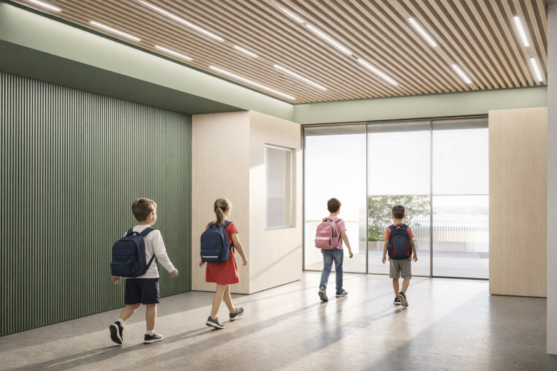 The project also includes an extension above the ZAD building and the introduction of rooftop spaces, including a multipurpose hall and playground. Internally, a multi-level atrium replaces the former external stairs, creating a central circulation space that connects all floors and introduces natural light into the interior.