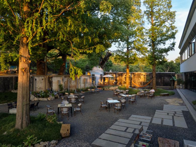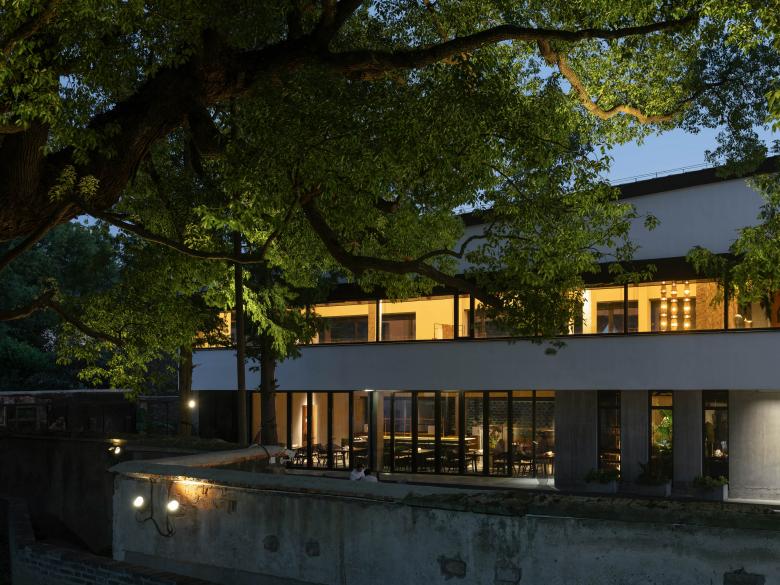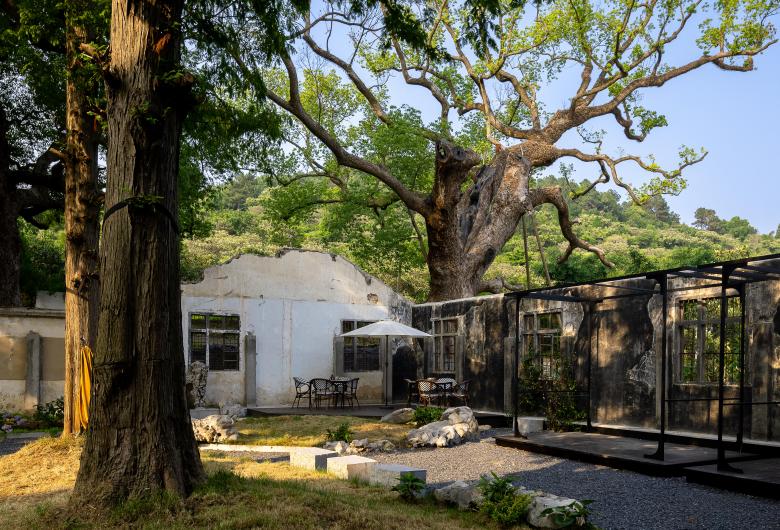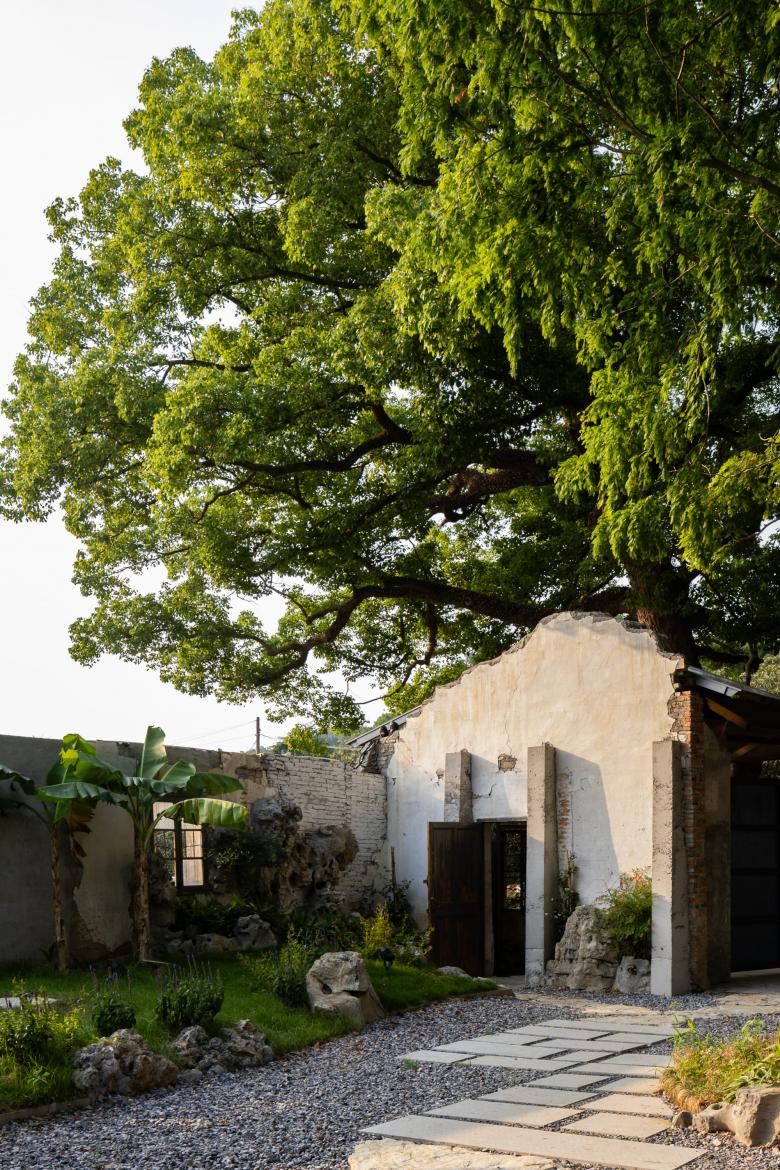 古树往往具有独特的场域感,当这个具有历史记忆属性的建筑和五棵古树并置时,创造了不同场域的交叠,因而产生了更多趣味性的空间,这种由并置而产生的交集传达了不同历史记忆的关系,也是一种建筑与环境间的关系。而选择以退让的处理方式(退在老墙内,退到树荫外),一方面是对历史和环境的尊重与保护,同时也意在弱化新建建筑的形式感,使其外部简单化而增强内部空间的多样性,以趋于景观化的姿态融在历史和环境中。