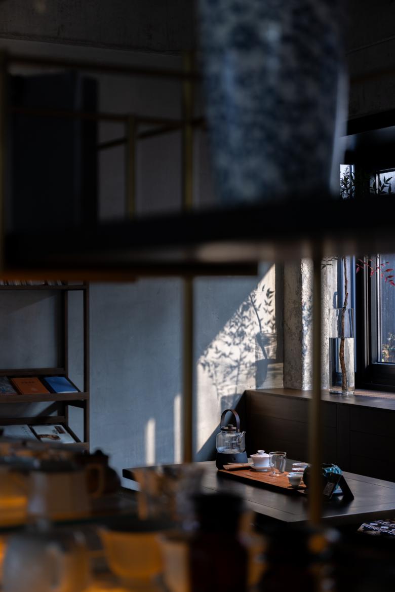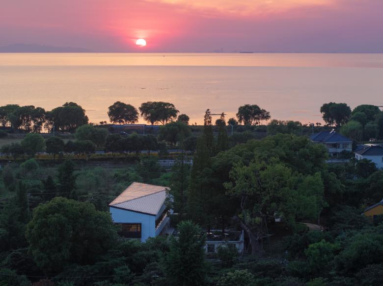 将新的建筑内退为老墙加固提供条件;北侧靠近古樟的部分完全退让满足古树保护要求并留出庭院空间让来客可以感受古樟之美;南侧靠近太湖部分设两层层高以观太湖美景;为守住庭院中四棵挺拔的水杉保留了旧有建筑的合院,根据建筑使用需求植入一字型体量并采用折形屋面建立整个建筑的形式契合江南水乡特色,整个建筑以谦恭的姿态融入老墙、古樟与村落。