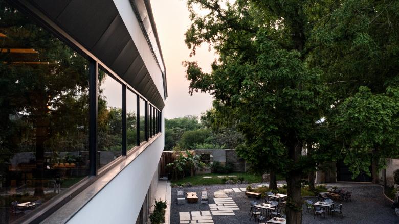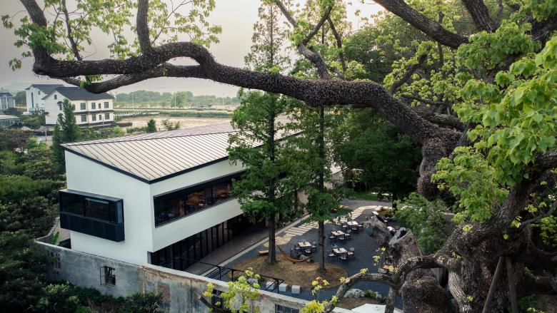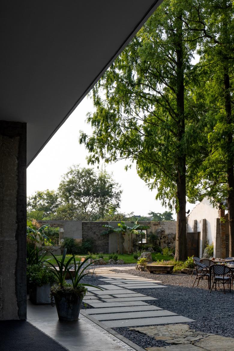 我们基于古树保护要求,保留院内的水杉及在硬化基础上设置休息区,供人们休息和活动。新建的建筑皆采用白色艺术外墙漆和深灰色铝镁锰屋面,以当代的方式回应江南水乡的粉墙黛瓦。