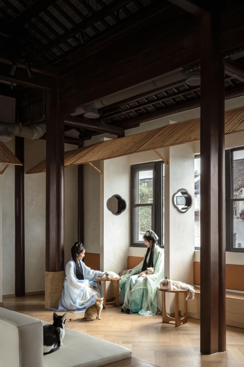 The exterior maintains the traditional dark-tile roofing style, drawing attention through refined signage, warm lighting, and inviting elements such as the second-floor terrace and display windows. As guests pass through the hallway and ascend the staircase, they discover a surprisingly expansive and engaging pet café on the second floor—a hidden oasis awaiting exploration.