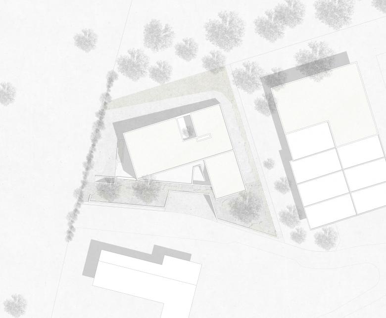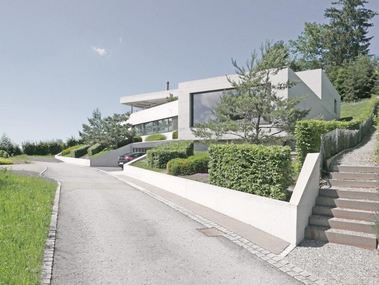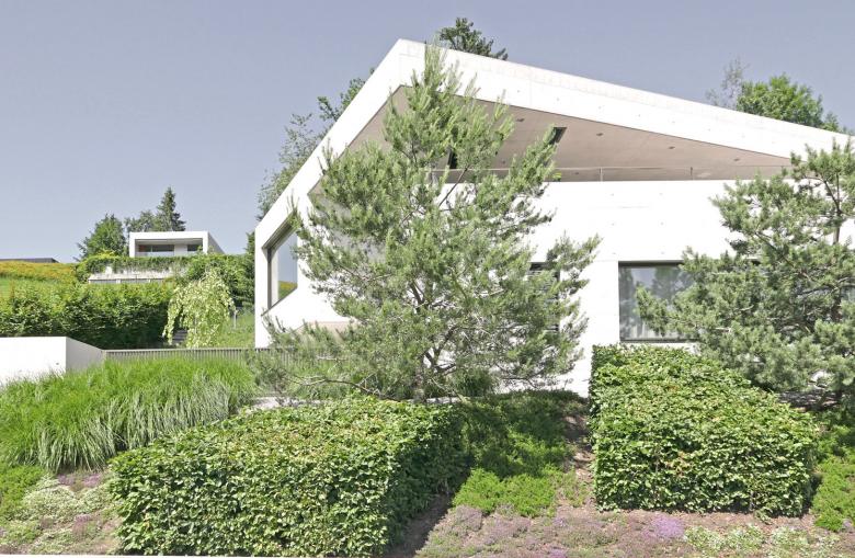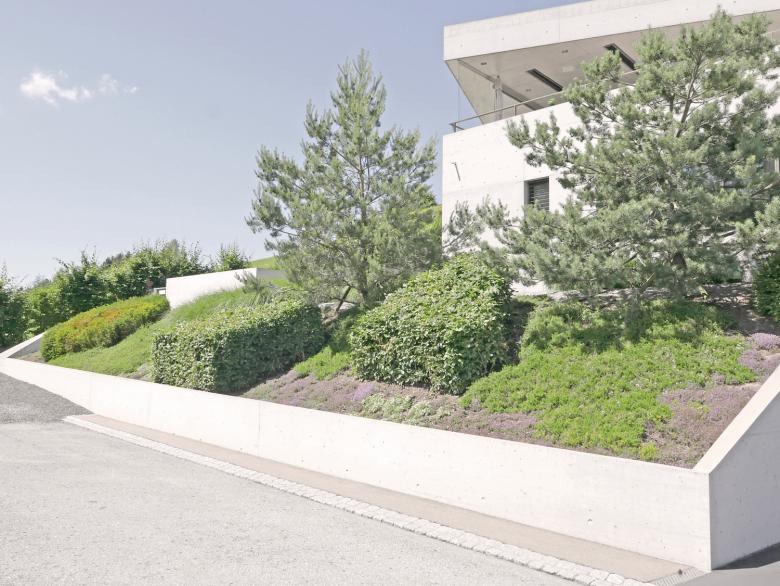 Der skulpturale Neubau aus Sichtbeton befindet sich in Niederteufen am Siedlungsrand mit fantastischem Blick auf das Alpsteinmassiv. Die einzelnen Kuben des Wohnbaus schichten sich abgewinkelt zueinander den Südhang hoch und generieren so diverse Terrassen, Innenhöfe und einen Patio. Passend zur reduzierten Ästhetik der Baute ist der Freiraum schlicht gehalten. Auf den Terrassen in den Innenhöfen und dem Patio findet sich der Kanfanar-Naturstein wieder, welcher auch in den Wohnbereichen verwendet wurde. Zum Haupteingang führt ein geschliffener, mit Kanfanar-Natursteinen durchsetzter Gussasphaltbelag. Gegen Süden prägen drei grosse Föhren das Bild und kontrastieren eindrucksvoll mit dem Grau des Sichtbetons. Einzelne amorph geschnittenen Gehölz- und Ziergrasgruppen, sowie flächige Thymianfelder, strukturieren die Hangbereiche gegen die Obere Schulhausstrasse. Sandfarbene Vierkant-Pflanzgefässe, eine grosszügige Lounge, Sonnenschirme und ein langer Esstisch möblieren die Hauptterrasse. Die Terrasse im Westen wurde mit einem Wasserbecken und einer Ziergrasrabatte ergänzt.