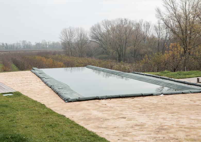 La piscina e l’orto-giardino appaiono ritagliati come due asole all’interno di un continuum di superficie architettonica—un sistema di pavimentazione in pianelle di cotto lavorate a mano e posate con tecnica tradizionale—la cui uniformità materica rimarca la concezione spaziale. L’area della piscina è stata disegnata in relazione fortemente integrata con il giardino di specie erbacee ed arbustive, a creare spazi in sequenza, un dispositivo ottico attraverso cui affacciarsi verso i campi ed il fiume.