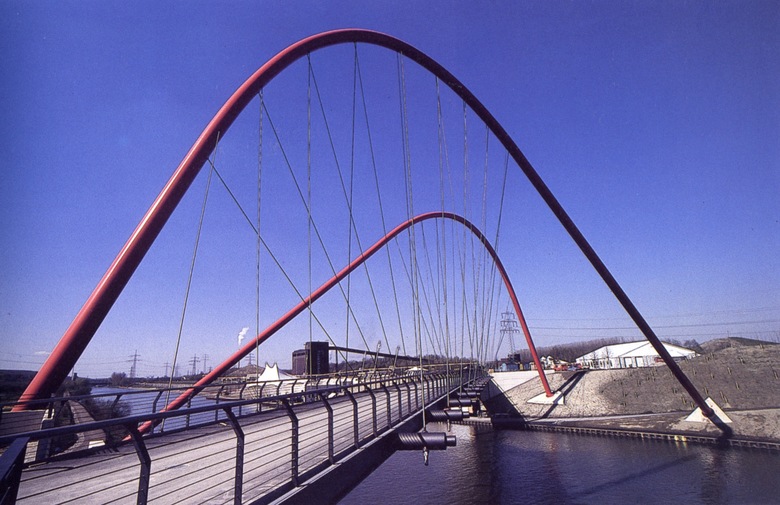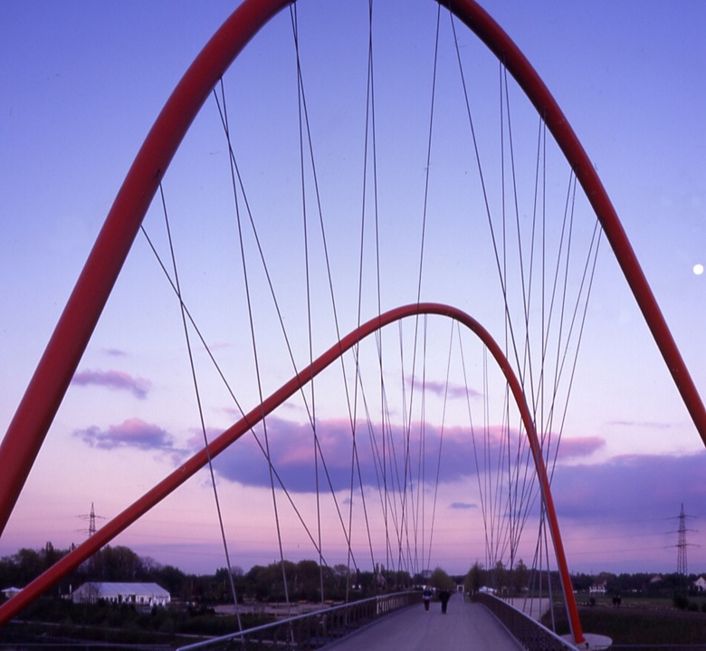 Die Brücke über den Rhein-Herne Kanal bildet innerhalb des BUGA-Geländes das wichtigste Bindeglied zwischen den für den Fußgängerverkehr seit mehr als hundert Jahren getrennten Stadtteilen Horst und Heßler. Die Brücke ist Teil eines Ensembles von fünf Brücken, dessen Baumaterial, Stahlrohr in unterschiedlichster Form, auf die Geschichte der Region und des Geländes Bezug nimmt. Historische Bogenbrücken entlang des Rhein-Herne-Kanals und der Emscher waren weitere vorgefundene Entwurfselemente. Die außergewöhnliche und asymmetrische Form der Brücke resultiert aus der langen Diagonalen der Haupterschließungsachse und dem Doppelbogen-Haupttragwerk, welches über die kürzeste Spannweite, das heißt rechtwinklig zum Kanal, ausgerichtet ist. Die Fahrbahn wird über Abspannseile abgehängt. Die Bögen, Primärfarbe BUGA-Rot, haben gleichzeitig eine Funktion als Portal, sowohl für die Schiffahrt als auch für die Fußgänger und Radfahrer. Die Brücke stellt eine begehbare Raumplastik mit großer Signifikanz dar.
