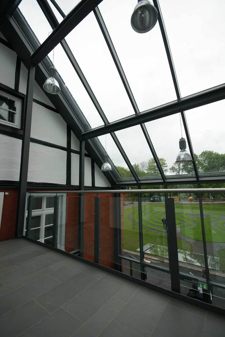 Ein Restaurant ist ebenso vertreten. Eine transparente Erschließungszone verbindet Alt und Neu und stellt als Glasfuge den Übergang zwischen dem denkmalgeschützten Bestand und der modernen Erweiterung dar.