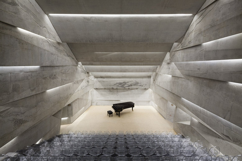 Der monolithische, gekippte Baukörper öffnet sich für die Konzertbesucher auf dem neuen Dorfplatz und führt von dort diese über eine Treppe hinab in das unter der Erdoberfläche liegende Foyer. Dieses erschließt nicht nur die Funktionsräume wie die Garderobe, die Sanitärräume sowie den Barbereich, sondern führt auch spannungsreich um den Zuschauerraum herum ins Innere des Konzertsaales. Dieser entfaltet seine Akustik innerhalb des leicht wirkenden Betonkörpers, dessen präzise Lichtschlitze den Raum beleuchten. Der Baukörper des Konzertsaales ist in Ortbeton gefertigt, dessen diffizile Form nur mittels einer äußert aufwändig konstruierten Schalung realisiert werden konnte. Die dominanten gekippten Oberflächen des Konzertsaales sind allein akustischen Vorgaben geschuldet und beinhalten hinter ihren Schlitzen neben LED-Leuchten auch Bassabsorber, die eine optimale Akustik bieten. Der Beton im Inneren des Konzertsaals ist unbehandelt. Seine lebendigen Oberflächen dienen dazu, die mittelhohen Töne zu absorbieren. Die Schräge des Baukörpers - bedingt durch die Steigung des Hanges - trägt die Zuschauertribüne, deren transparent wirkenden Stühle über Lichtschlitzen zu schweben scheinen. Die Stühle sind auf Eisenschwertern aus Stahl, auch unter den Stufengängen sind Absorber eingebaut. Die Bühne des nicht als Multifunktionsraum, sondern allein als Konzertsaal konzipierten Gebäudes ist mit moderner LED Bühnentechnologie ausgestattet.