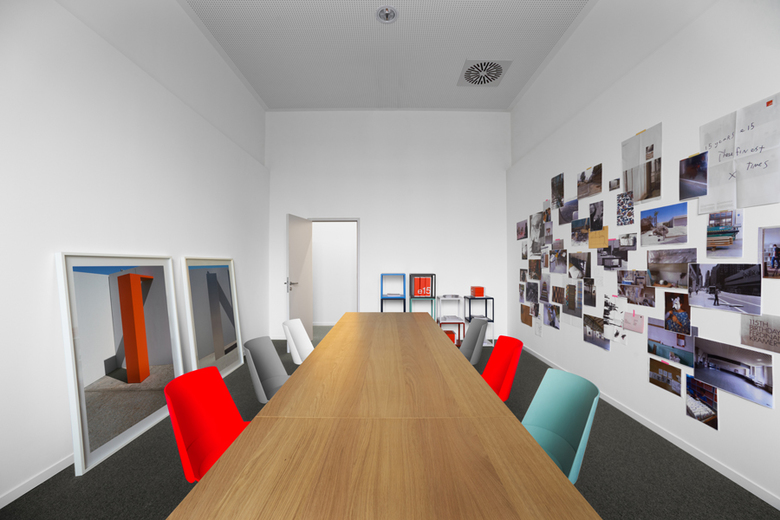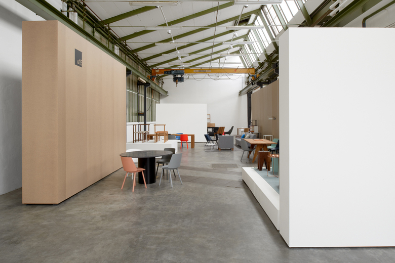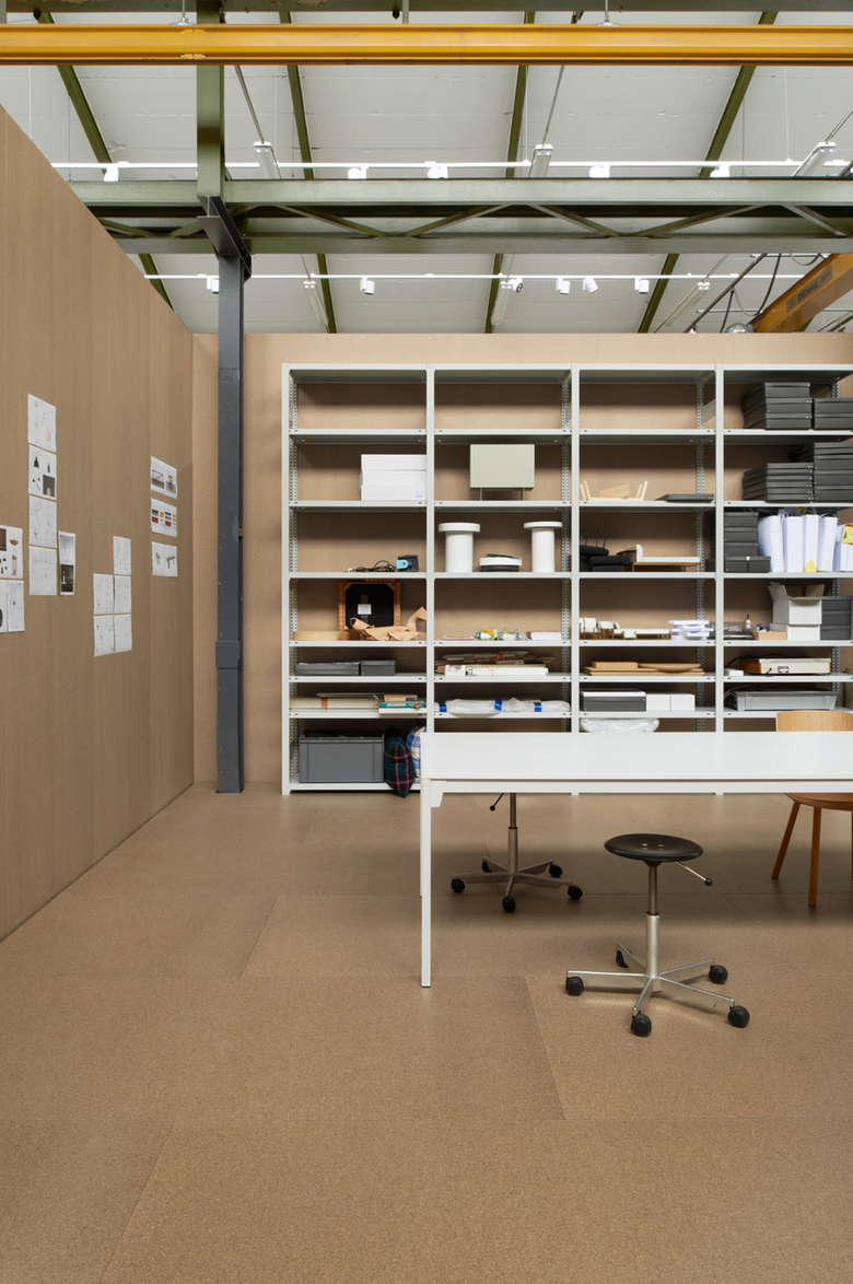 Ein zusätzliches Industrielager vor Ort wurde als Ausstellungs- und Atelierfläche umgestaltet. In der großzügigen Halle mit Betonboden und ausfahrbarem Kransystem entstand ein Raum im Raum, der als Think Tank und Besprechungsraum sowie Modellbauwerkstatt fungiert. Die Struktur aus klar lackierter Spanplatte unterstreicht die authentische Umgebung. Darüber hinaus wird der Raum durch eine Reihe weißer Wände und Plattformen unterteilt, wodurch einzelne Präsentationsbereiche für die e15-Kollektion geschaffen werden.