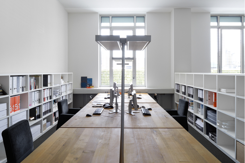 Die ehemals 540 m² große Kantine der Firma Lurgi wurde in die neuen Büros von e15 und PHILIPP MAINZER OFFICE FOR ARCHITECTURE AND DESIGN umgewandelt. Unter Beibehaltung des industriellen Charmes der Backsteinarchitektur mit ihren langgestreckten Satteldächern wurde die großzügige Kantine komplett entkernt und ein helles und geräumiges Großraumbüro mit Akustikdecke realisiert. Ohne die Großzügigkeit des Raumes einzuschränken, sind die verschiedenen Abteilungen optisch und akustisch durch Regale voneinander getrennt. Über die gesamte Länge des Raumes wurden Trennwände installiert, die den Arbeitsplatz vom Backoffice- und Lagerbereich trennen und den Raum weiter strukturieren. Schreibtische aus massiver Eiche setzen im klaren Bürointerieur ein optisch kontrastierendes, warmes Highlight.