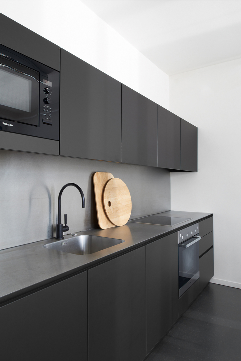 Mit dem vorhandenen Gebäudebestand wurden ein großzügiger Besprechungsraum und eine Küche sowie separate Einzelbüros für Verwaltung und Buchhaltung geschaffen. Der Raum im ersten Stock wurde in eine geräumige Gemeinschaftsküche und -bibliothek umgewandelt, die zusätzlichen Arbeitsraum bieten. Die individuell gestaltete Einbauküche aus schwarz eingefärbten Vollkernplatten unterstreicht den bescheidenen Charakter des Innenraums.