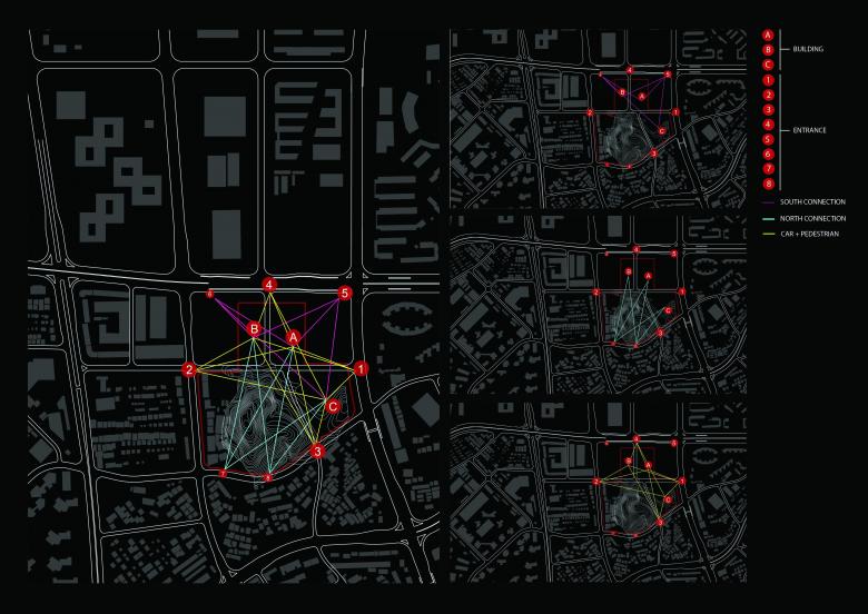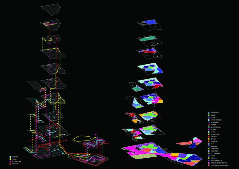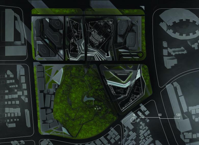 The concept started with the combination of human and nature. Taking the Golden Mountain Park, which is the most important local natural element into consideration. The new configuration has been shaped starting from a parametric analysis of the site, including water runoff, view, traffic and land use of the surrounding area. The aim of the design strategy is to foster the integration of this area into the surrounding with a vibrant, ecological, commercial program on the ground level and a highly social and cultural program on the top, so as to create a new model of the art centre.