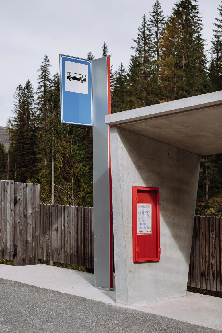 The individual elements are made from durable materials: galvanized steel parts are combined with concrete elements of various surface finishes, using dolomite rock aggregate and local larch and pine wood. The limited use of color is borrowed from Sexten’s logo. The concrete parts are prefabricated, cast in the factory for quick assembly on-site, and the molds are reusable for future bus stops. The larch wood comes from a windfall in the local forest and is used for the vertical wooden surfaces. The seating is made of pine wood, which does not splinter. Concrete provides durability in the harsh alpine climate, while the wood adds warmth—both materials harmonize with the natural surroundings, characterized by extensive forest areas and pale mountain walls.