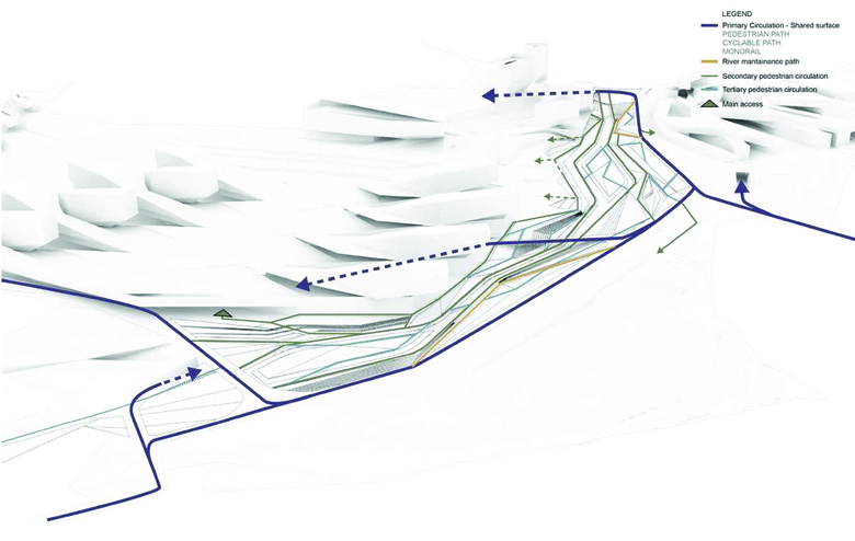 The educational bands of the K12 and of the University are organized along a Back Bone and on Podiums, which links diverse functions and produces new connections through social interactions. The social interaction is fostered by inserting semi public/ leisure activities within the academic environment, so as to create a common strata, where the knowledge is distributed through informal encounters among students.