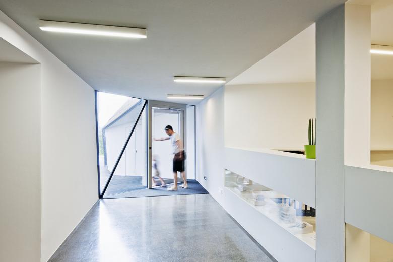 In Paramount Alma (2014), an extension above an existing building, two bands follow a geometrically complex volume, push behind and above the existing white cube, in this way the boundaries between roof and façade disappear and connections to the surrounding topography are created. The interiors benefit of several external spaces: openings of light and air vents offer all-round views and allow the view of the sky from the inside of the building, as a variation on the theme.