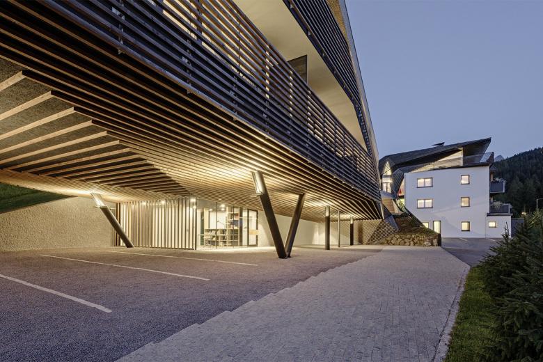 Strata Hotel (2007) is characterized by wooden strips that wrap it horizontally, generated by the surrounding topography.