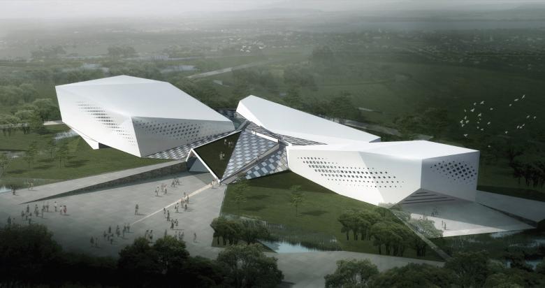 The inspiration for the Low-Carbon Exhibition Centre stems from geology: carbon is a product of intense geological forces and processes, its polygonal structure at once incredibly strong while adhering to linear and planar principles.